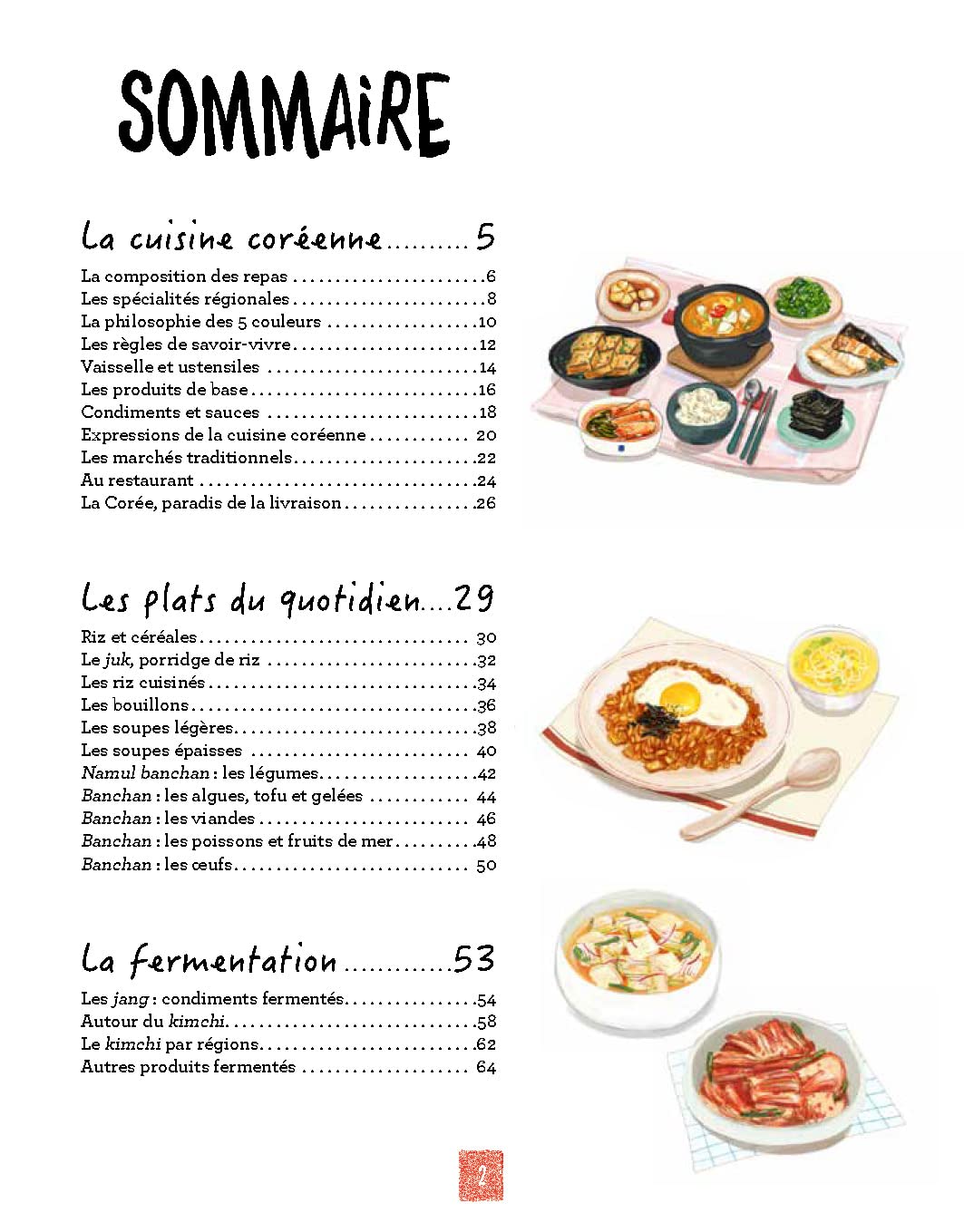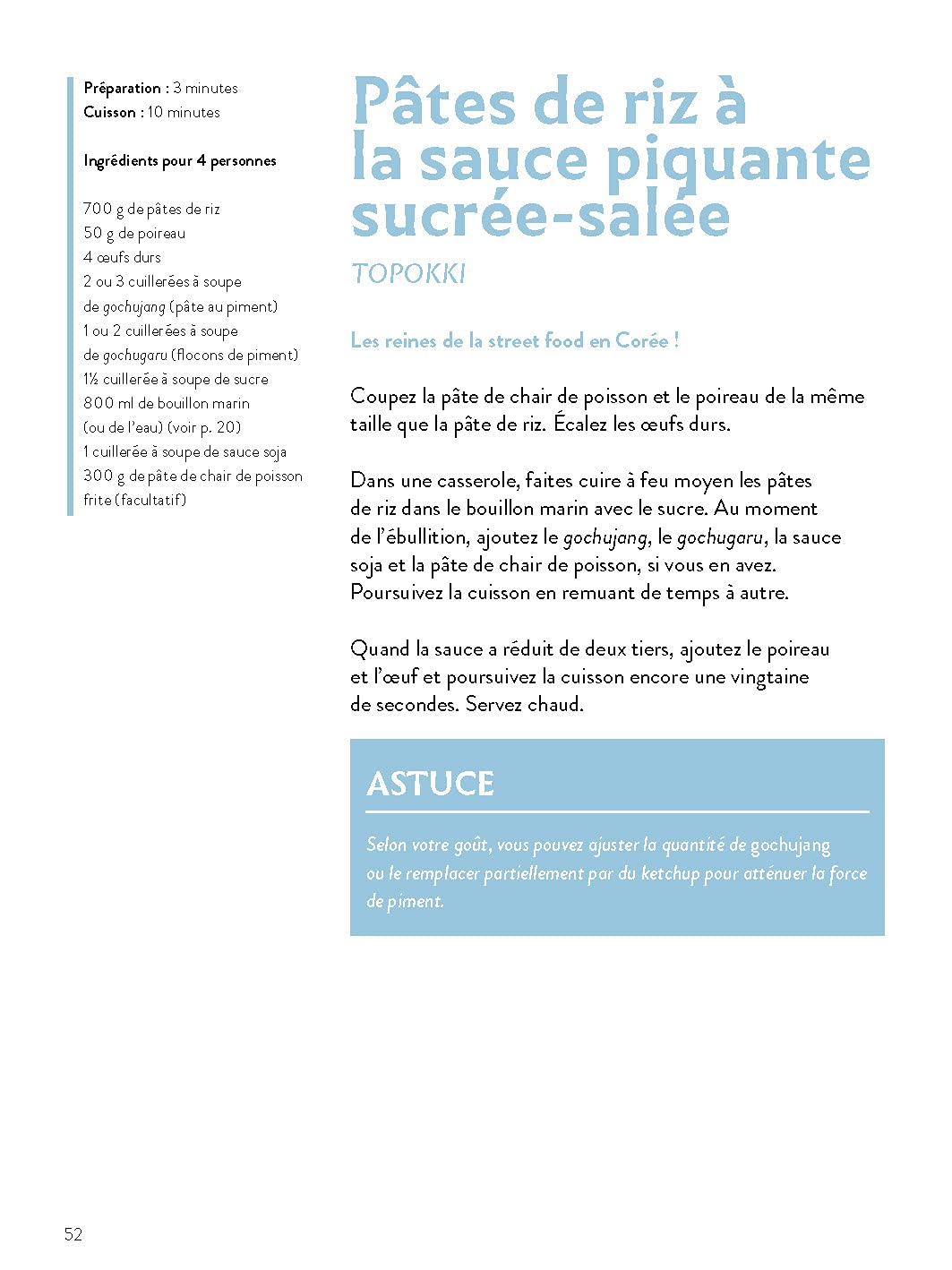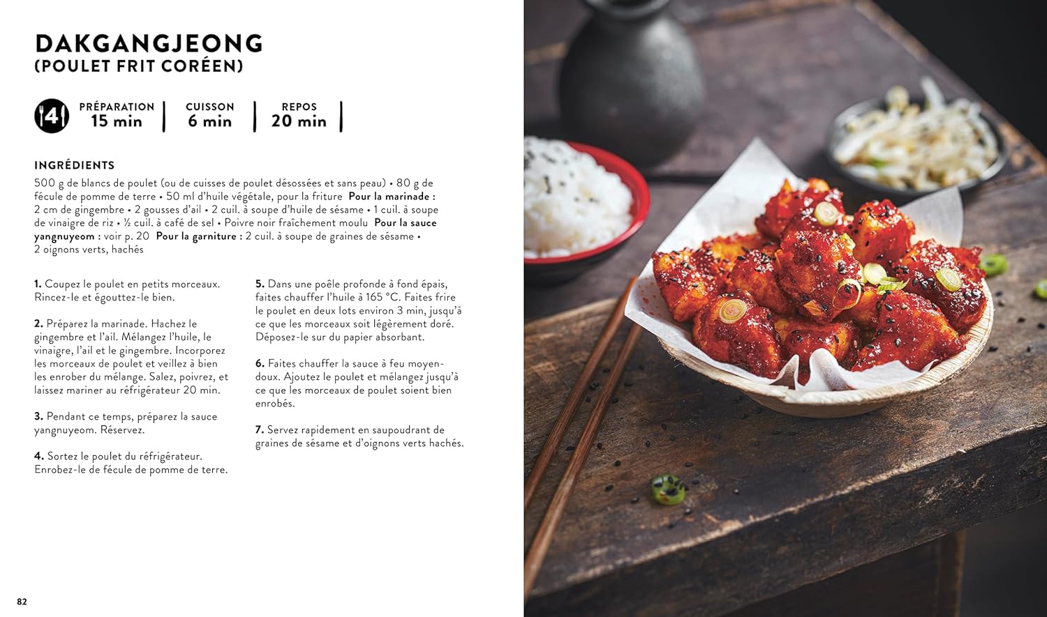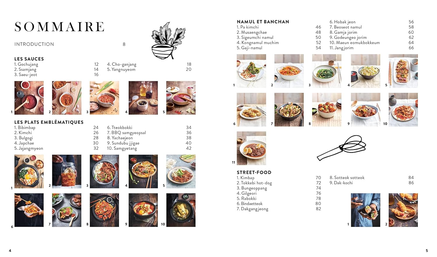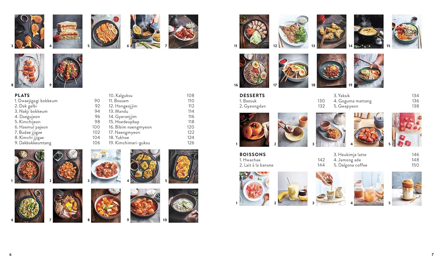 On y découvre bien sûr les classiques (kimchi, bulgogi, bibimbap), mais aussi des plats moins connus. Les recettes sont réparties en sept catégories alléchantes : cuisine de fête, soupes et ragoûts, accompagnements, apéritifs, street food, fusion et desserts.