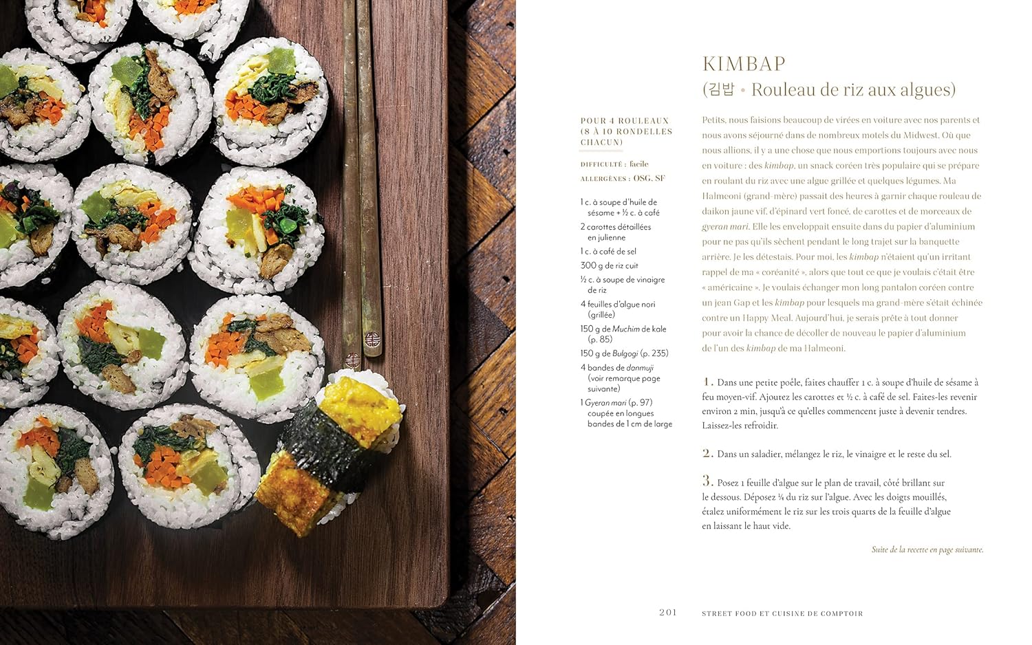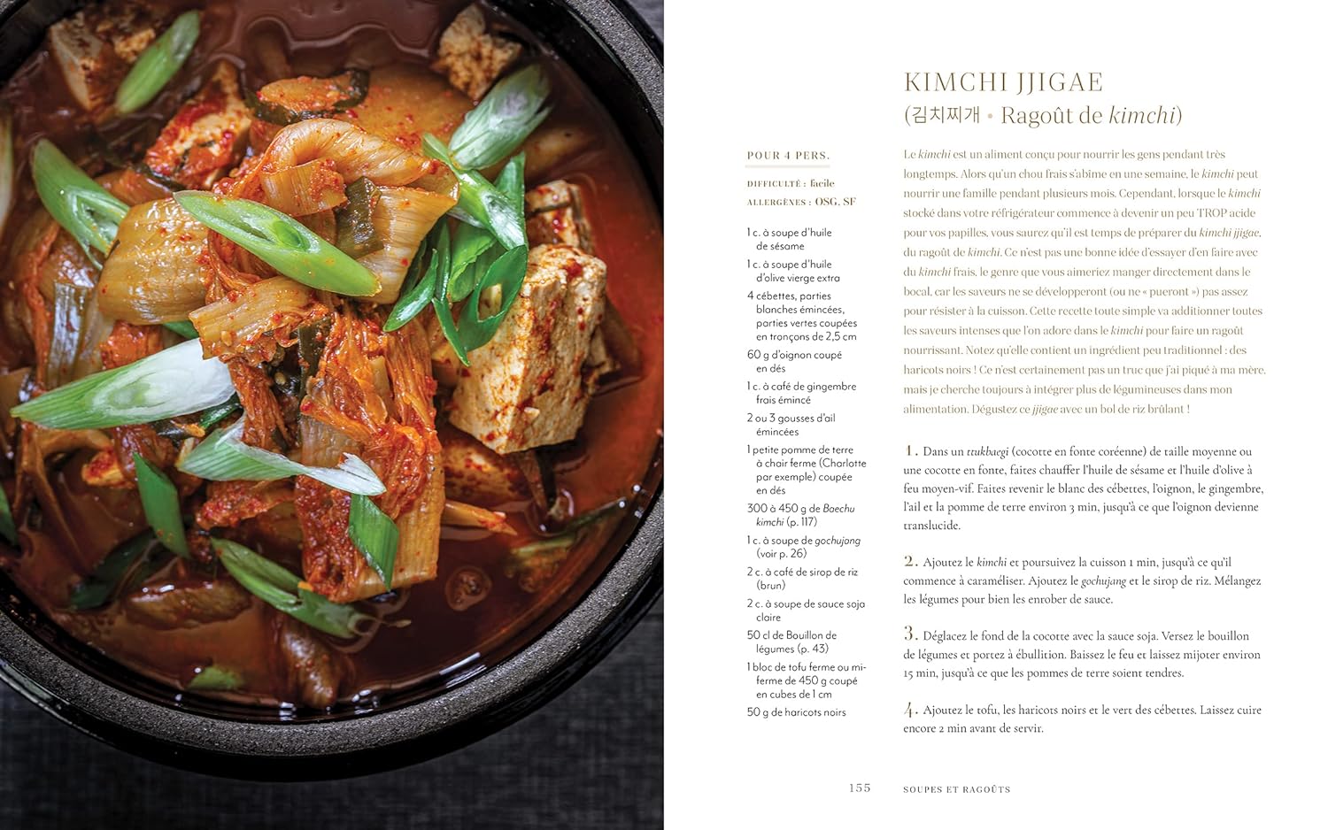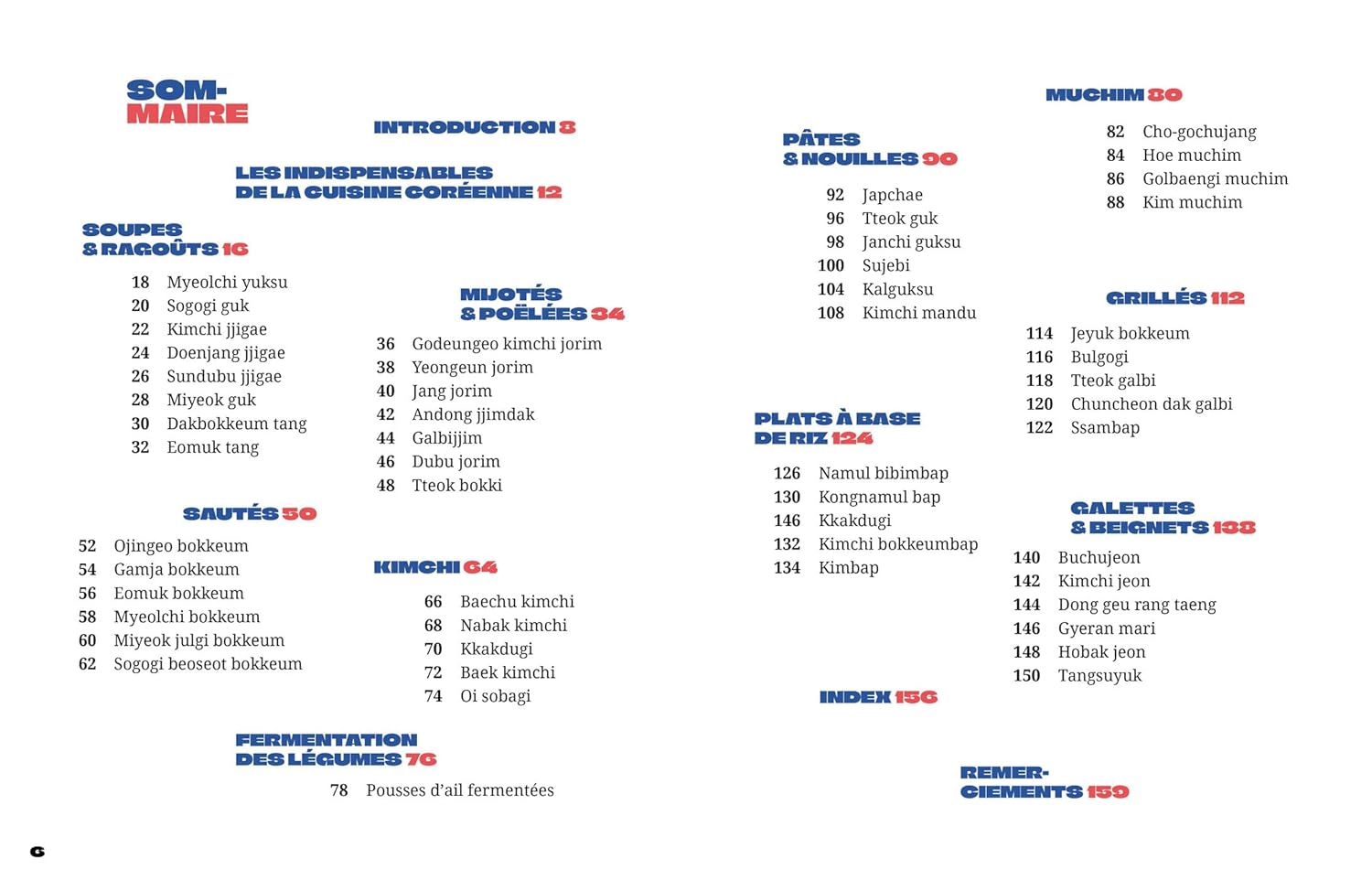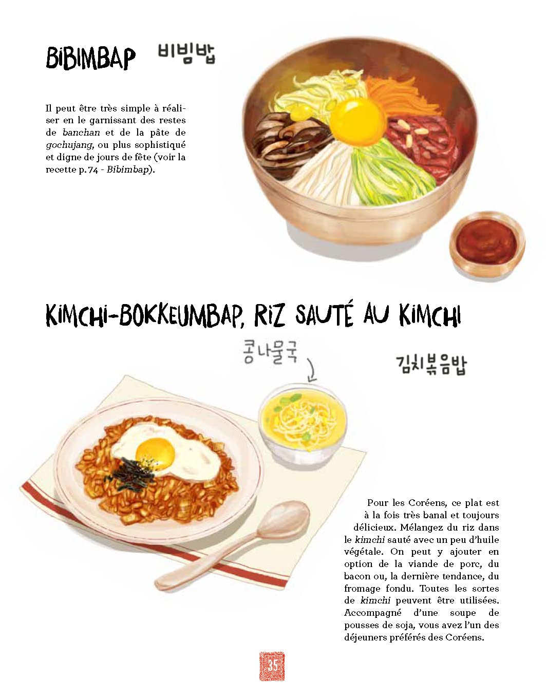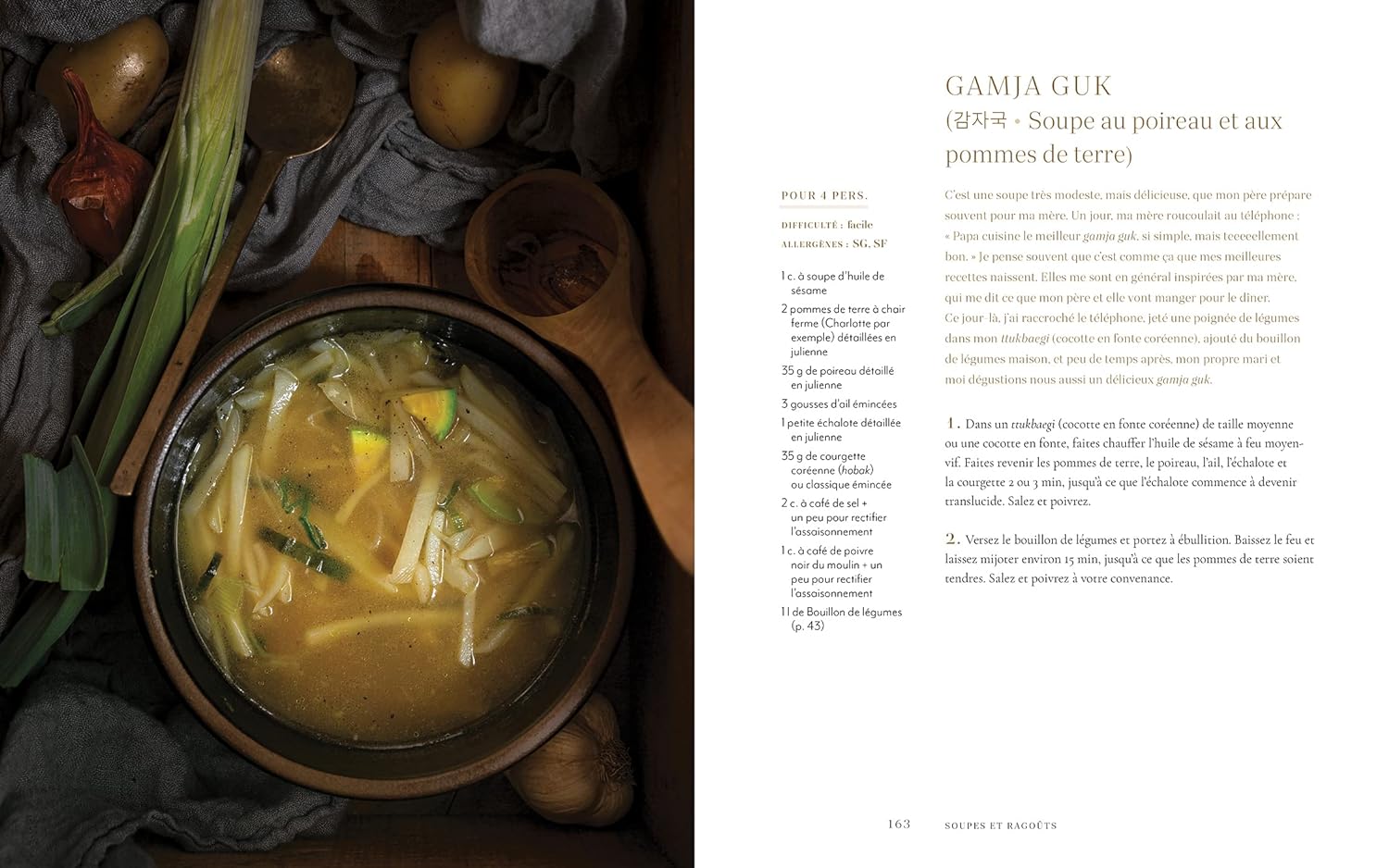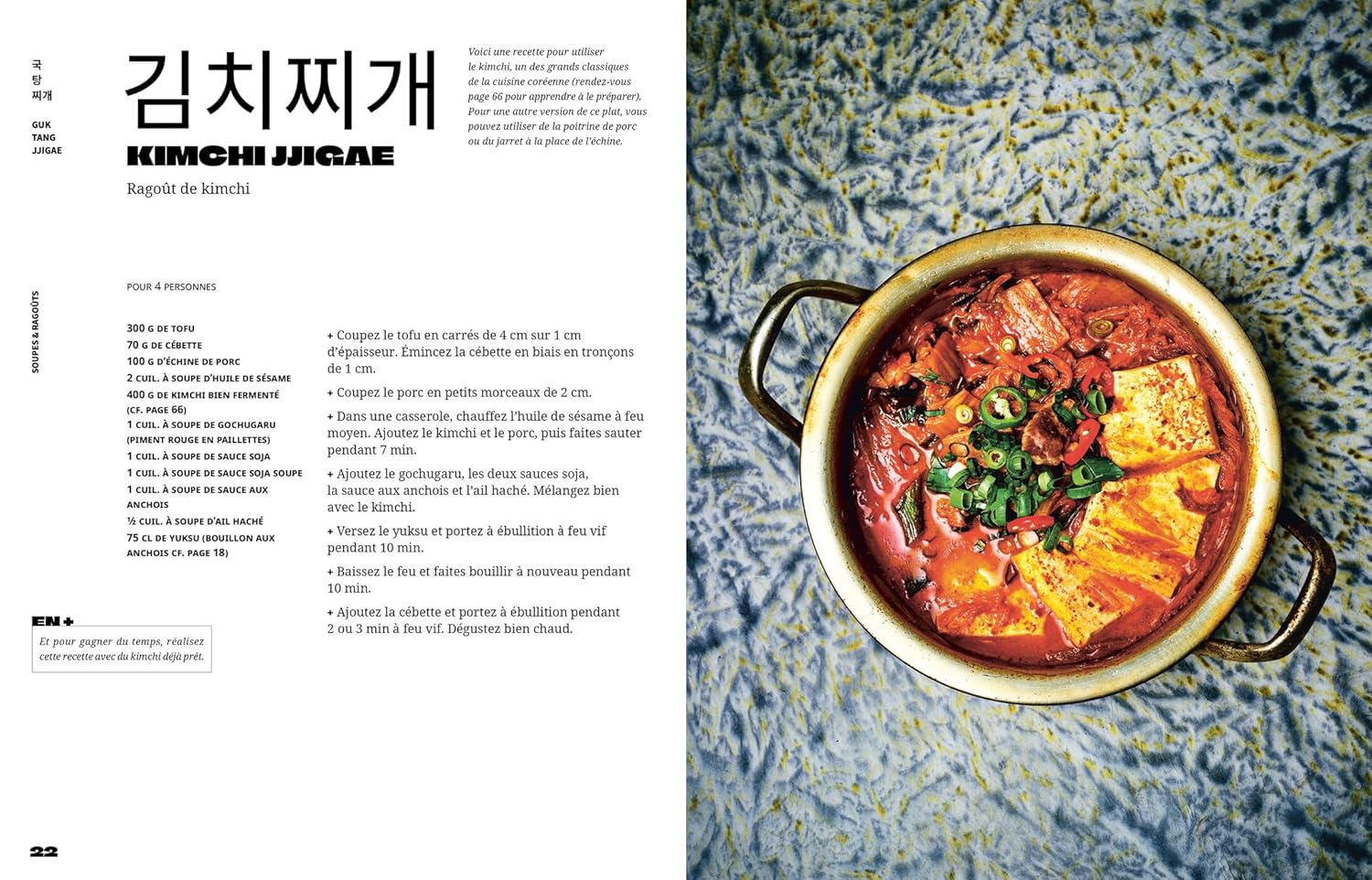 On y découvre bien sûr les classiques (kimchi, bulgogi, bibimbap), mais aussi des plats moins connus. Les recettes sont réparties en sept catégories alléchantes : cuisine de fête, soupes et ragoûts, accompagnements, apéritifs, street food, fusion et desserts.