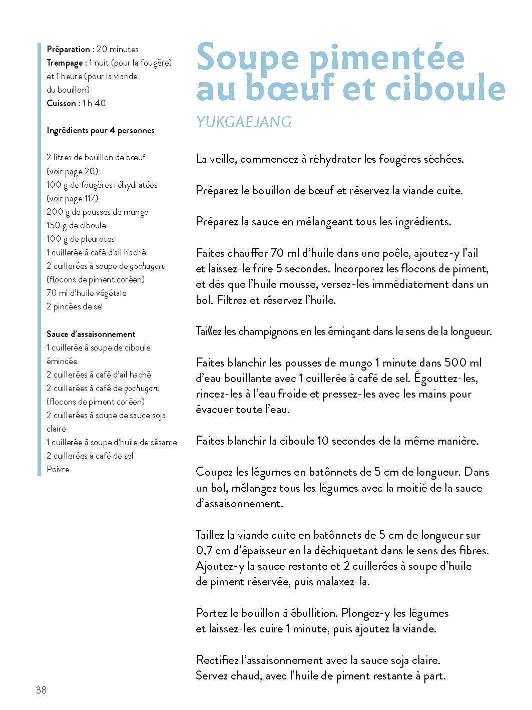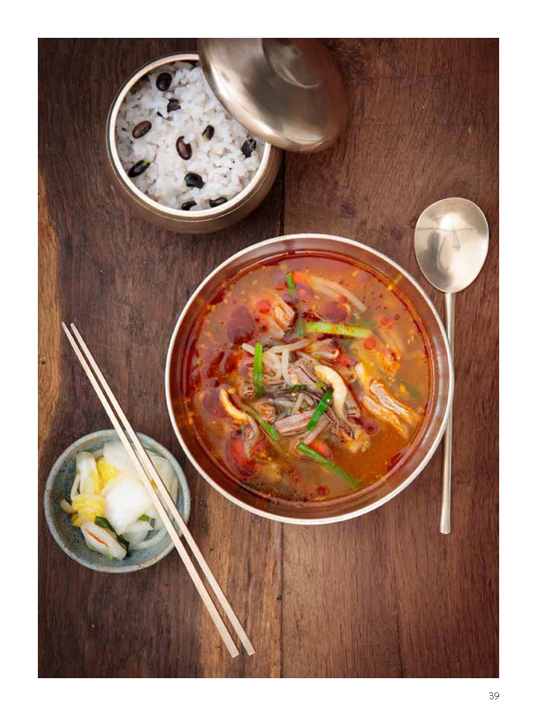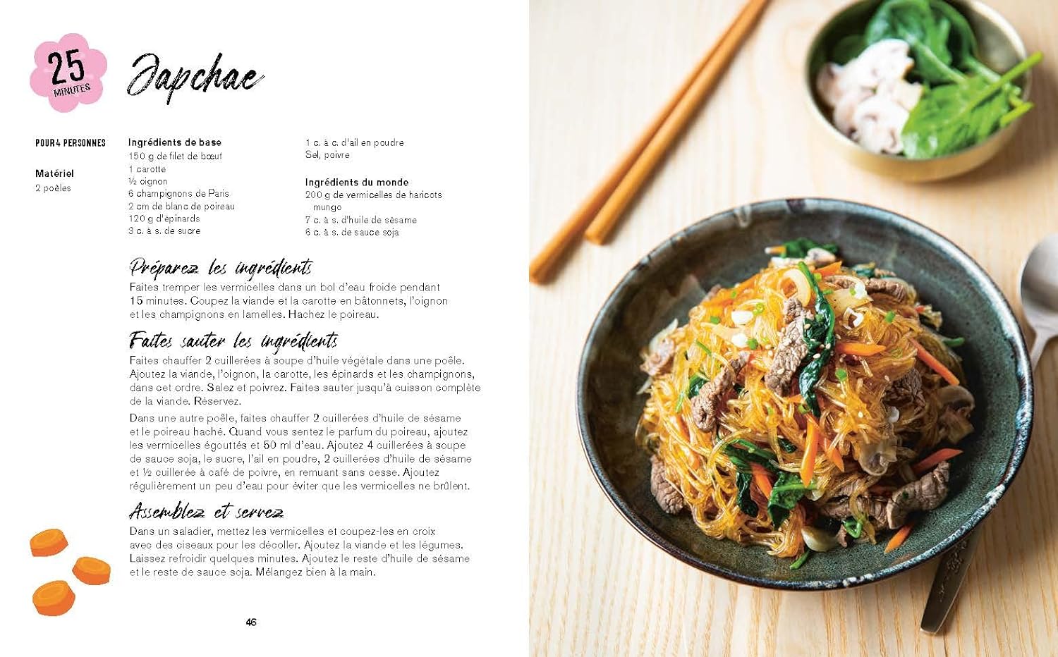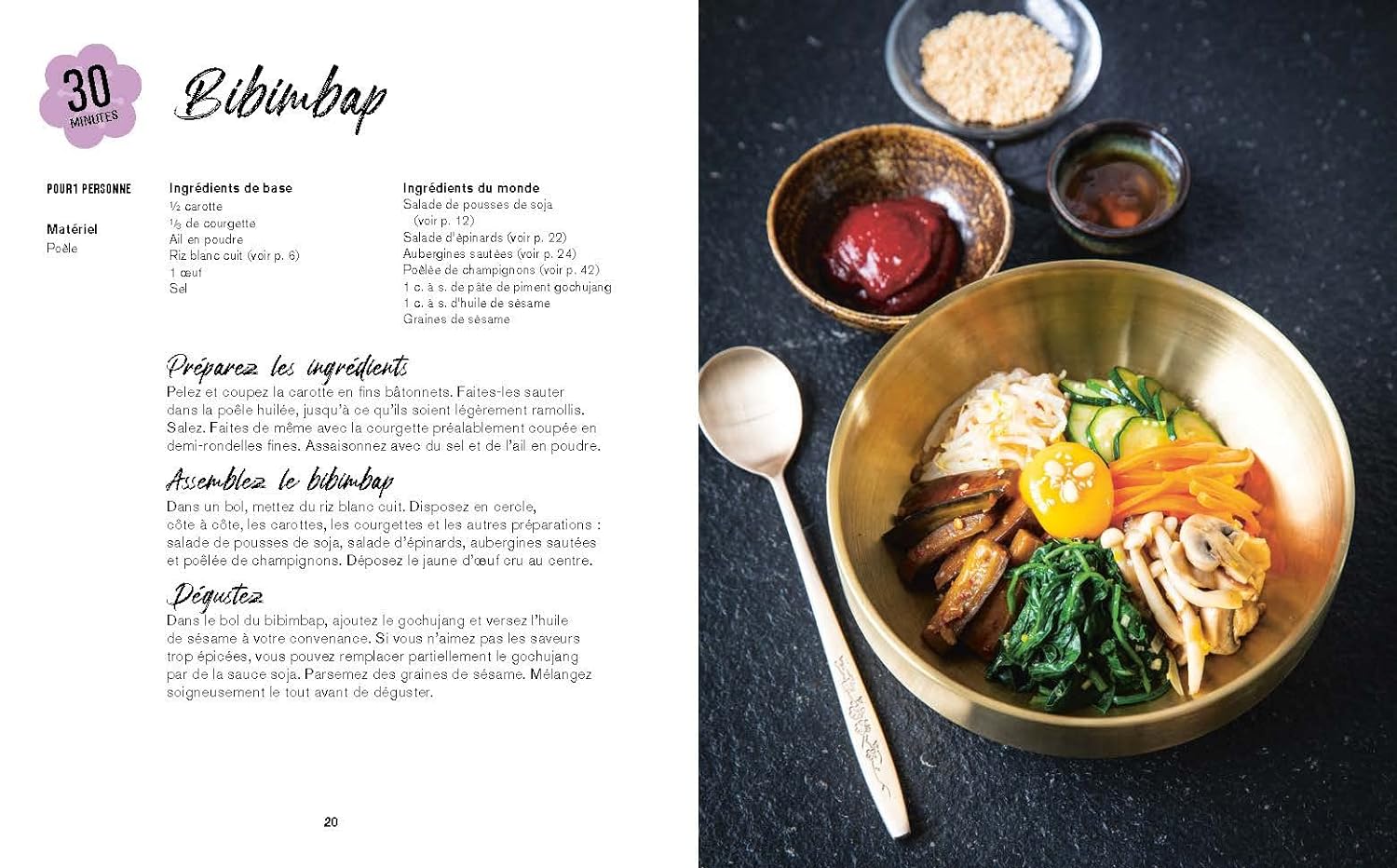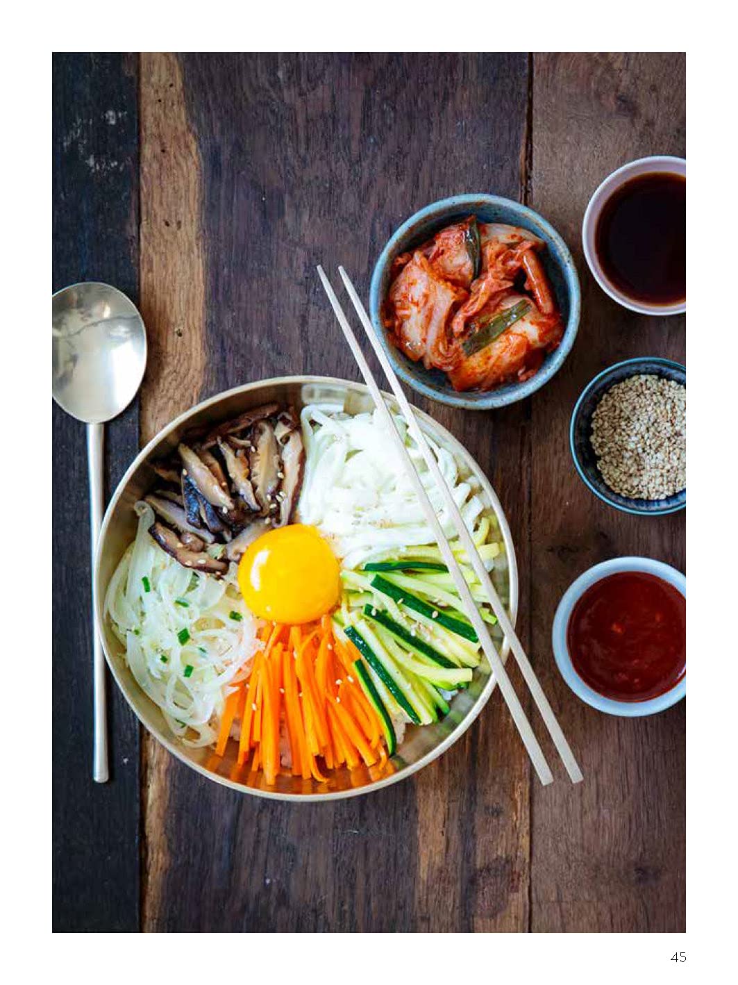 On y découvre bien sûr les classiques (kimchi, bulgogi, bibimbap), mais aussi des plats moins connus. Les recettes sont réparties en sept catégories alléchantes : cuisine de fête, soupes et ragoûts, accompagnements, apéritifs, street food, fusion et desserts.