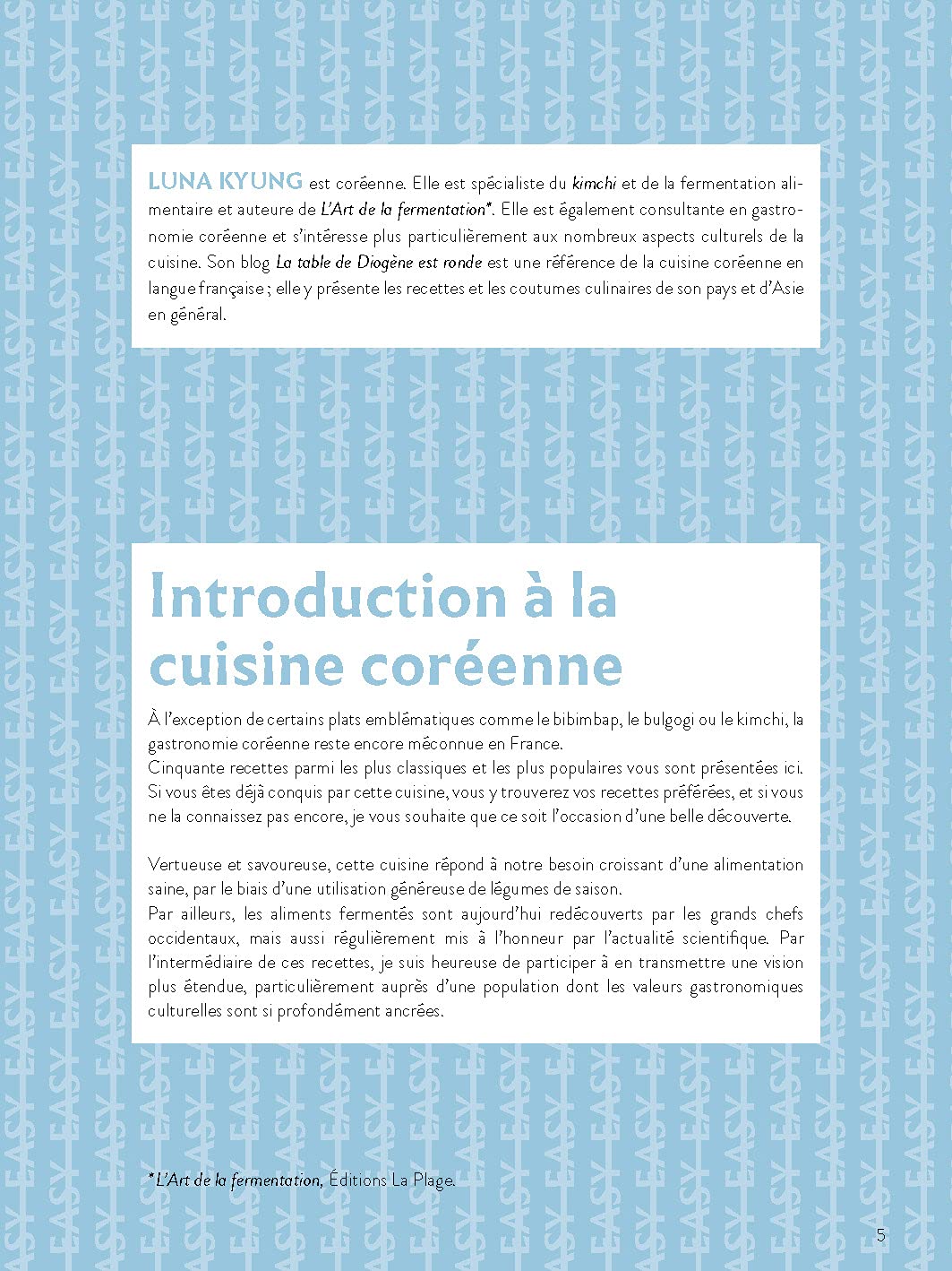 Avec « Easy Corée », Luna Kyung nous dévoile les secrets d’une des cuisines les plus saines au monde. On y trouve toutes les bases de la gastronomie coréenne. Des saveurs tour à tour piquantes, salées ou sucrées s’entremêlent dans des recettes délicieuses et faciles à réaliser.