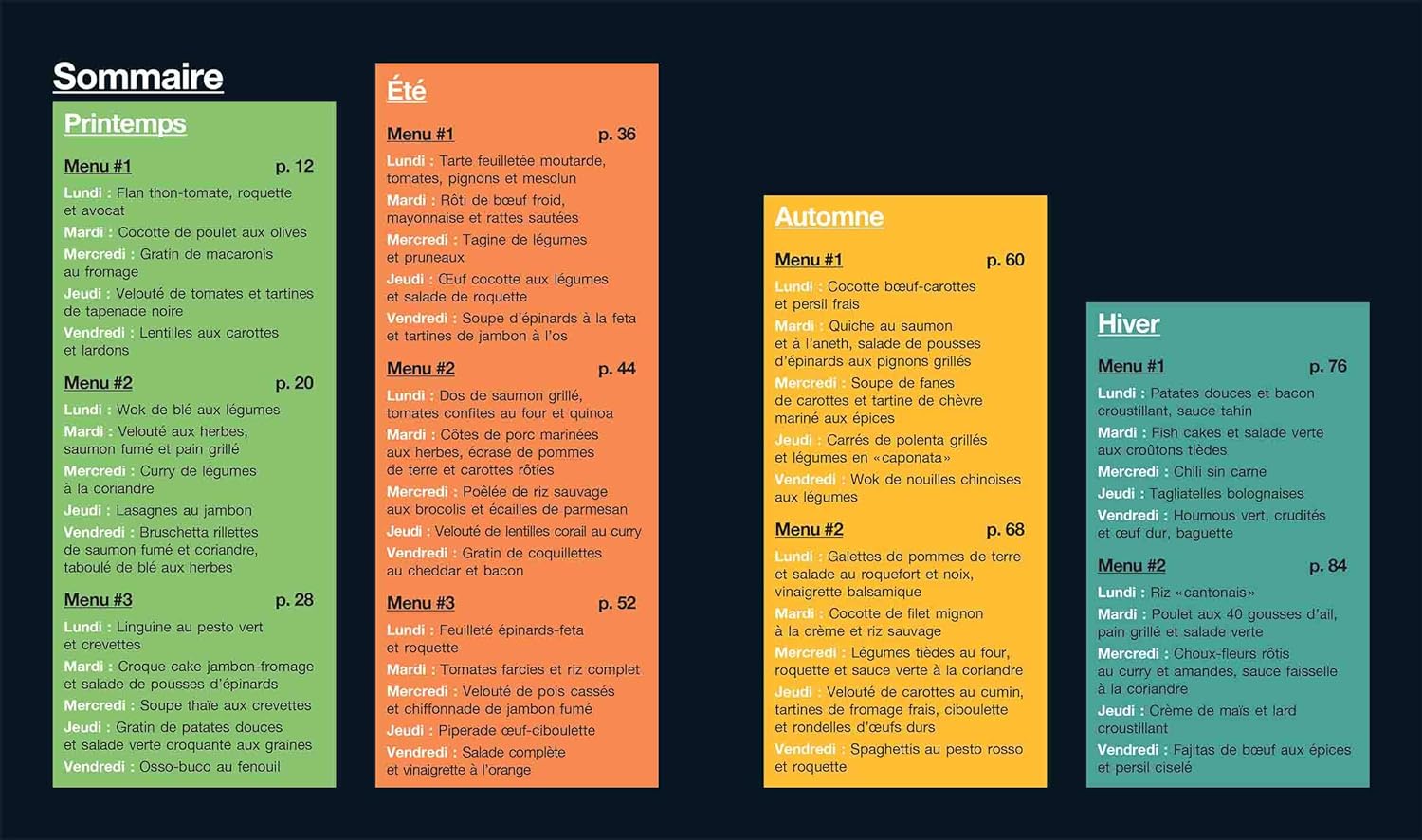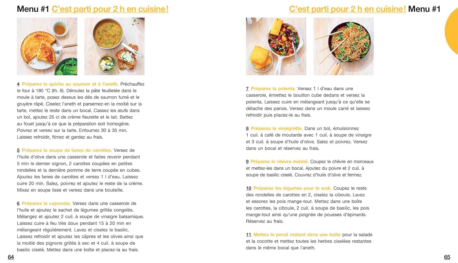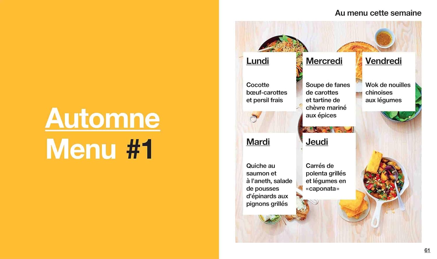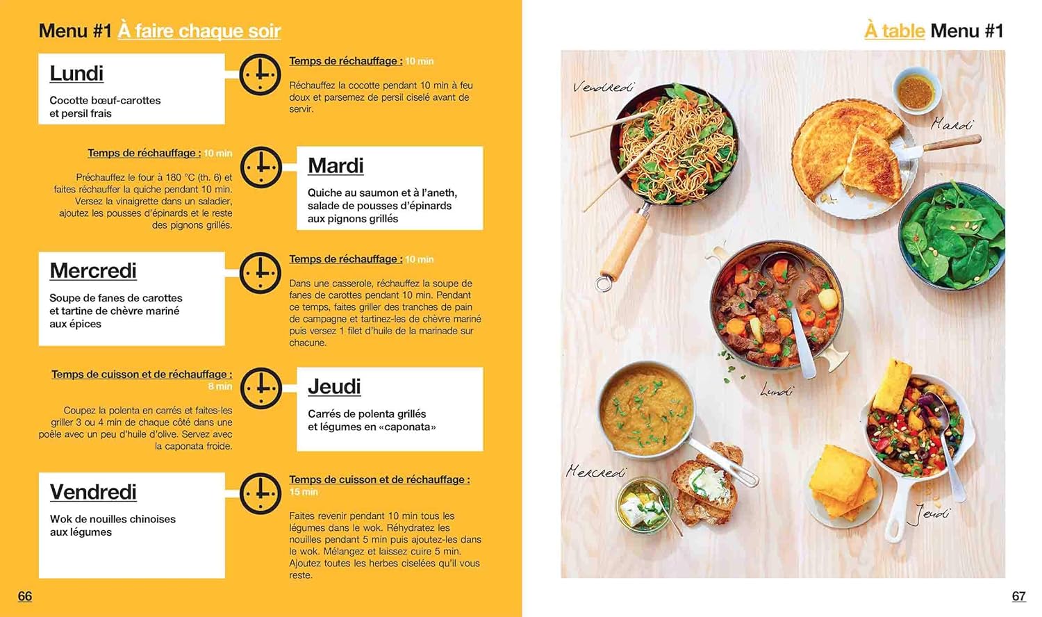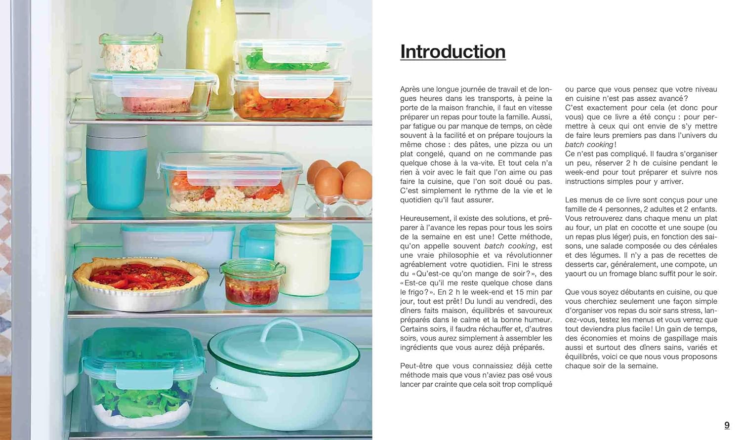 Fini le casse-tête des menus et les heures passées aux fourneaux ! Grâce à une organisation bien rodée, concoctez en 2 heures 16 menus hebdomadaires complets. Au programme : des plats équilibrés et savoureux à base de produits frais et de saison (légumes, fruits, viandes, poissons…). Une cuisine zéro déchet où tout est consommé.