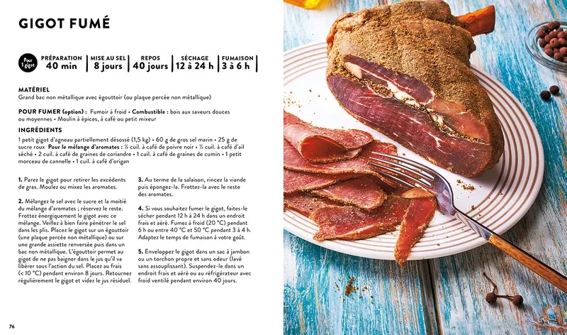 On y trouve des instructions claires pour le fumage à chaud (cuisson et fumage simultanés) et à froid (fumage sans cuisson). Les auteurs nous expliquent comment maîtriser le salage et le saumurage, essentiels pour préparer jambons et saucissons. Pas besoin d’équipement coûteux pour commencer. Un four ou un barbecue suffisent. Le livre propose même un tutoriel pour fabriquer son propre fumoir extérieur.