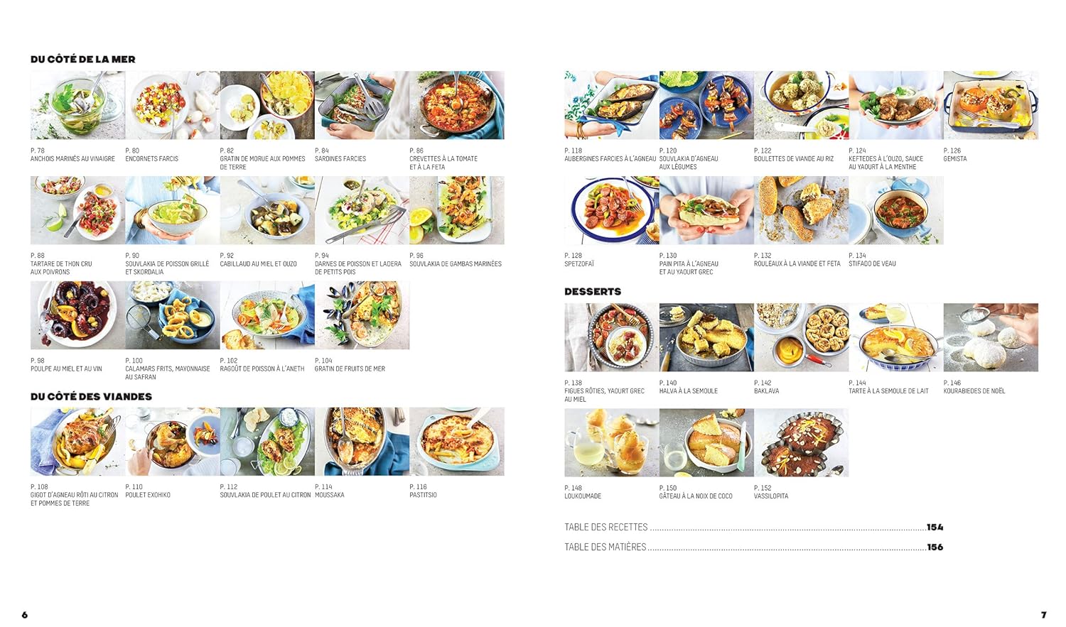 On y trouve une multitude de recettes traditionnelles, transmises de génération en génération. Des entrées aux desserts, en passant par les plats principaux, chaque région dévoile ses spécialités. Le tzatziki côtoie la moussaka, tandis que les crevettes saganaki rivalisent avec l’agneau en papillote.