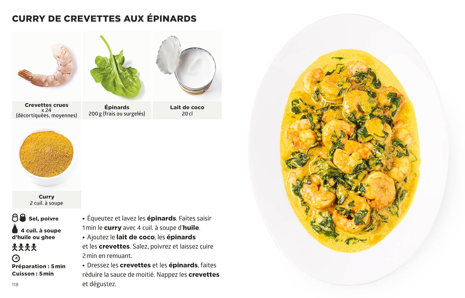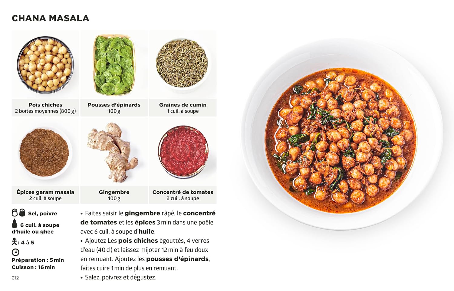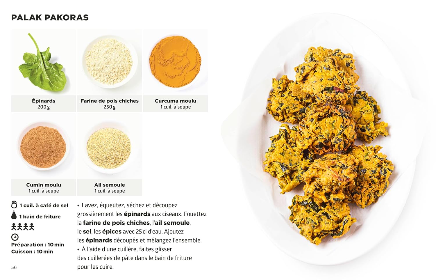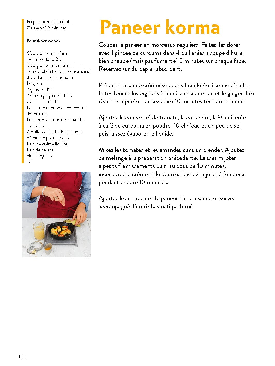 Chaque recette se compose de 2 à 6 ingrédients, illustrés par des photos. Les instructions, concises et limpides, sont accompagnées d’un cliché appétissant du résultat final. Un tableau pratique permet de remplacer les ingrédients rares par des alternatives courantes. Des recettes de base (pain indien, chutney, curry maison, etc.) complètent l’ensemble.