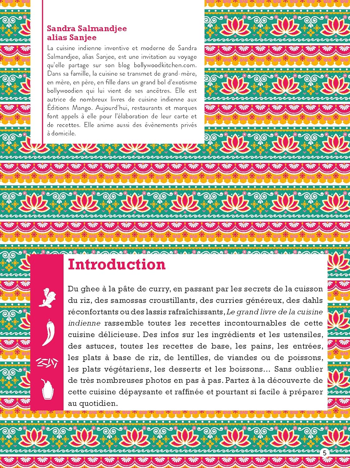 Envie de vous initier à la gastronomie indienne ? Pankaj Sharma, Sandra Salmandjee et Alice Charbin unissent leurs talents pour vous faire découvrir les secrets de cette cuisine aux mille saveurs. Avec simplicité, elles vous guident à travers les rites culinaires et les repas traditionnels.