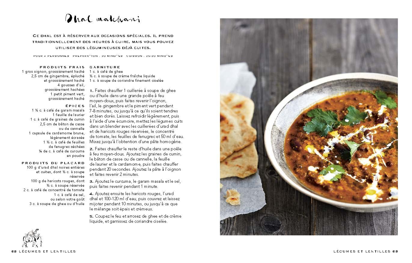 Plus de 80 recettes végétariennes sont présentées, des plus simples aux plus sophistiquées. On y trouve un éventail alléchant de préparations : chutneys (sauces épicées), masalas (mélanges d’épices), currys, dals (plats à base de légumineuses), bhajis (beignets de légumes) ou encore byrianis (riz parfumé).