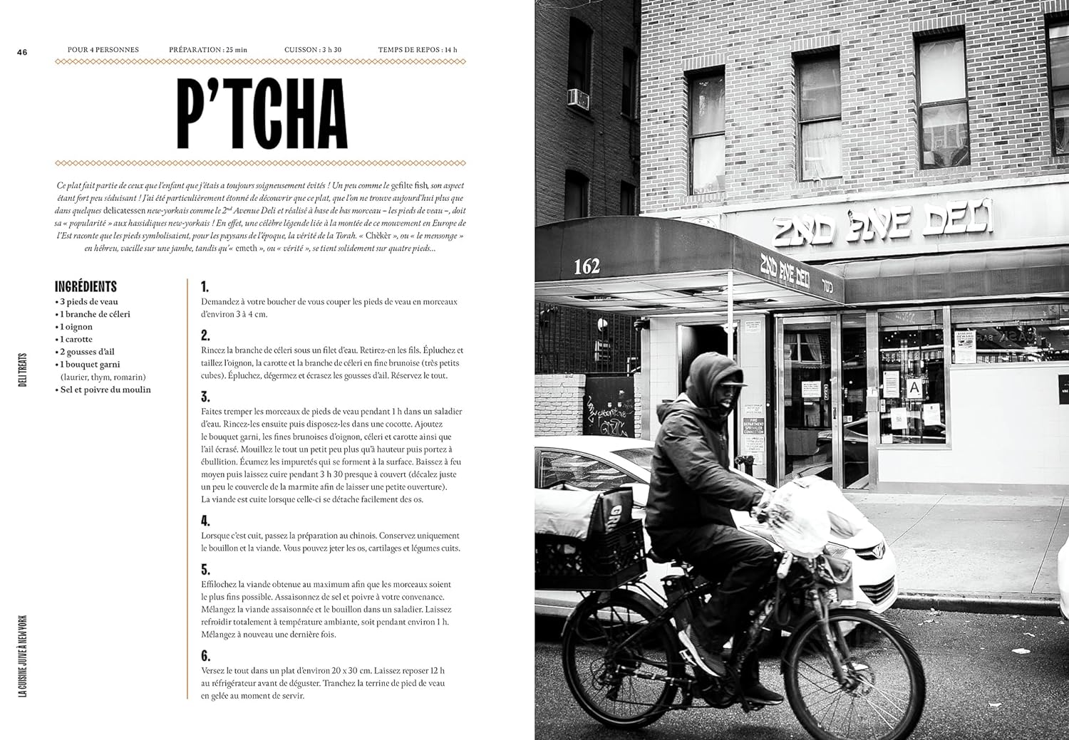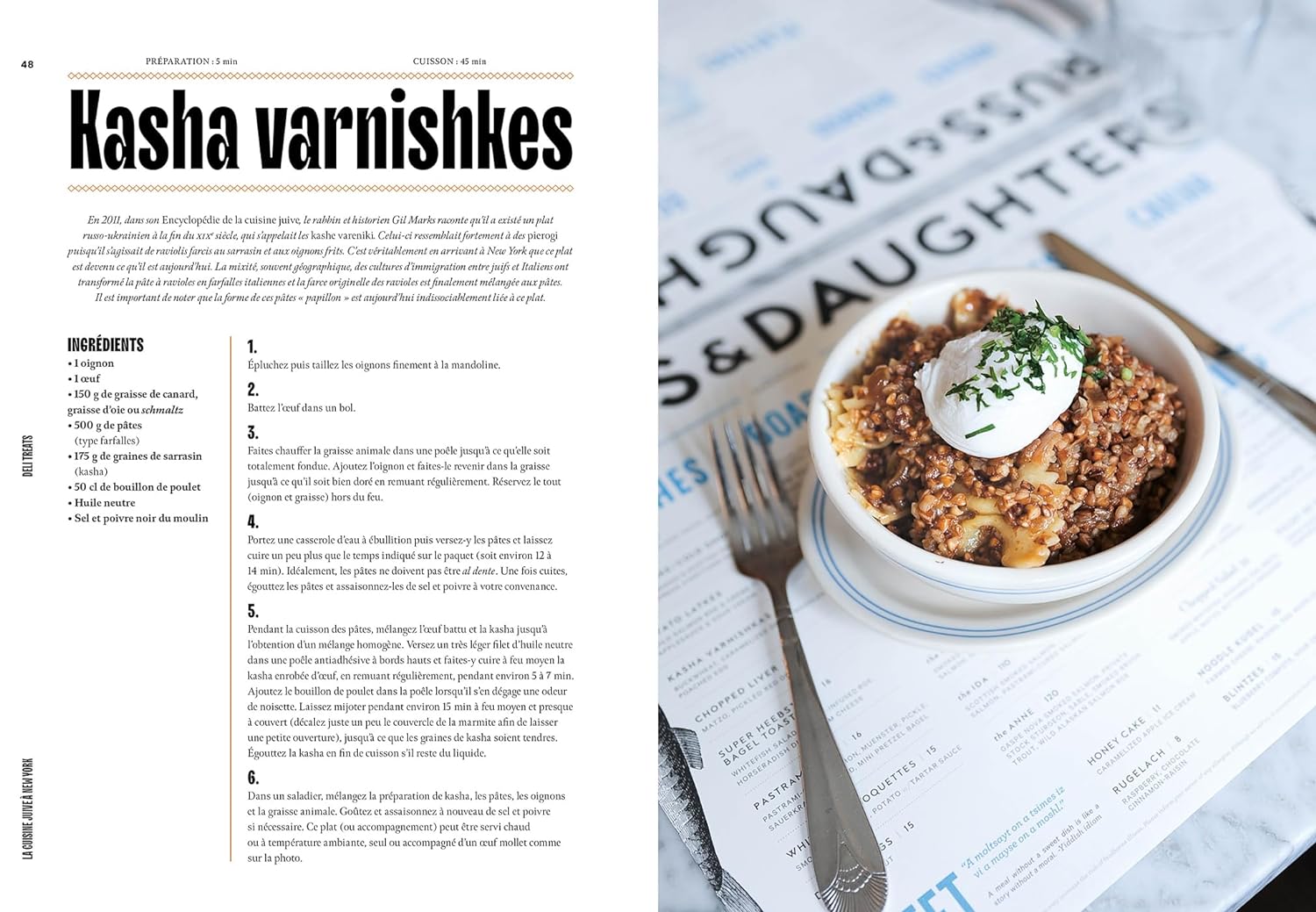 On y découvre une street food new-yorkaise alléchante : cookies, apple pie (tarte aux pommes), bob bowl (bol composé). Mais aussi une cuisine juive familiale réconfortante : pierogi (ravioles farcies), kugel (pudding de nouilles), cholent (ragoût de bœuf).