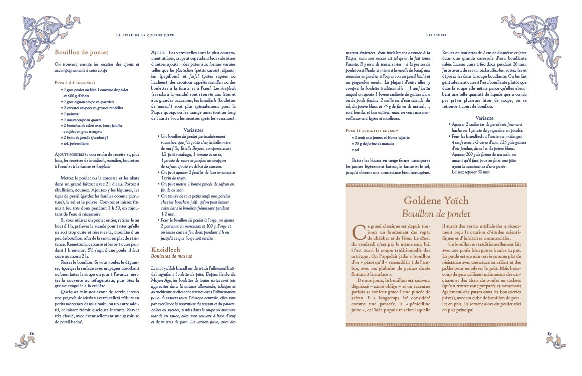L’auteure, Esther Gainsburger, ne se contente pas de lister des recettes. Elle nous guide aussi dans la constitution d’un placard idéal et propose des idées de menus. Les fêtes juives et leurs spécialités sont également abordées avec soin. Des anecdotes parsèment le texte.