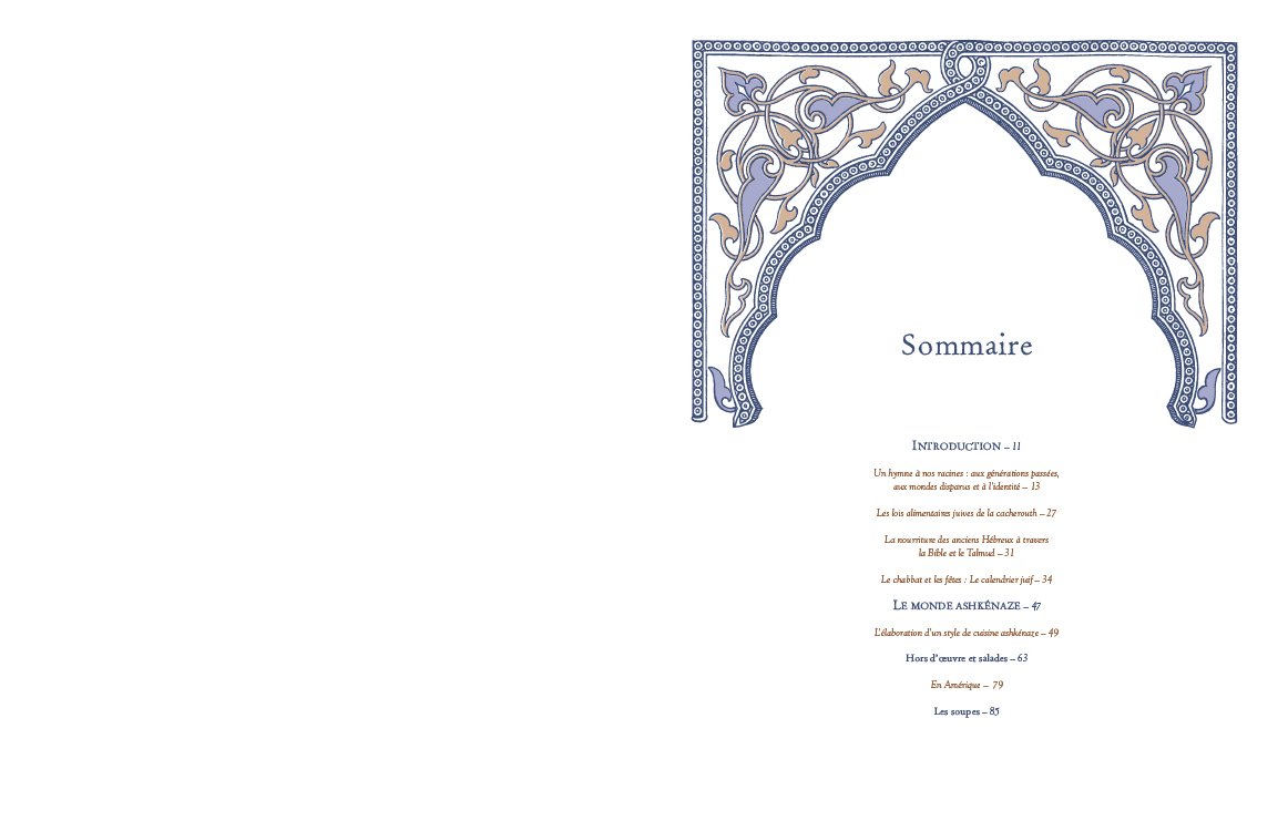 Tradition et modernité s’entremêlent dans ces pages. On y apprend à préparer des mets pour le quotidien ou les jours de fête. Vous y trouverez certainement votre bonheur parmi les condiments (sauerkraut, torshi), les entrées (pirojkis, bricks) et les plats principaux (klops, pkaïla). Sans oublier les accompagnements (latkes, kasha) et les desserts (strudel, cigares au miel).