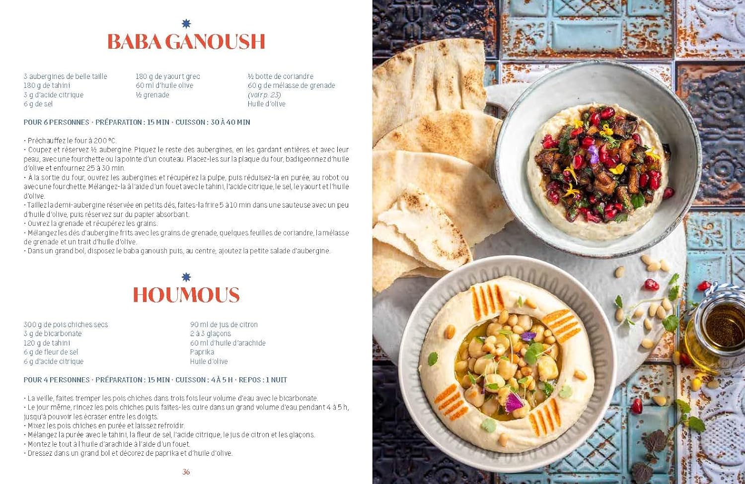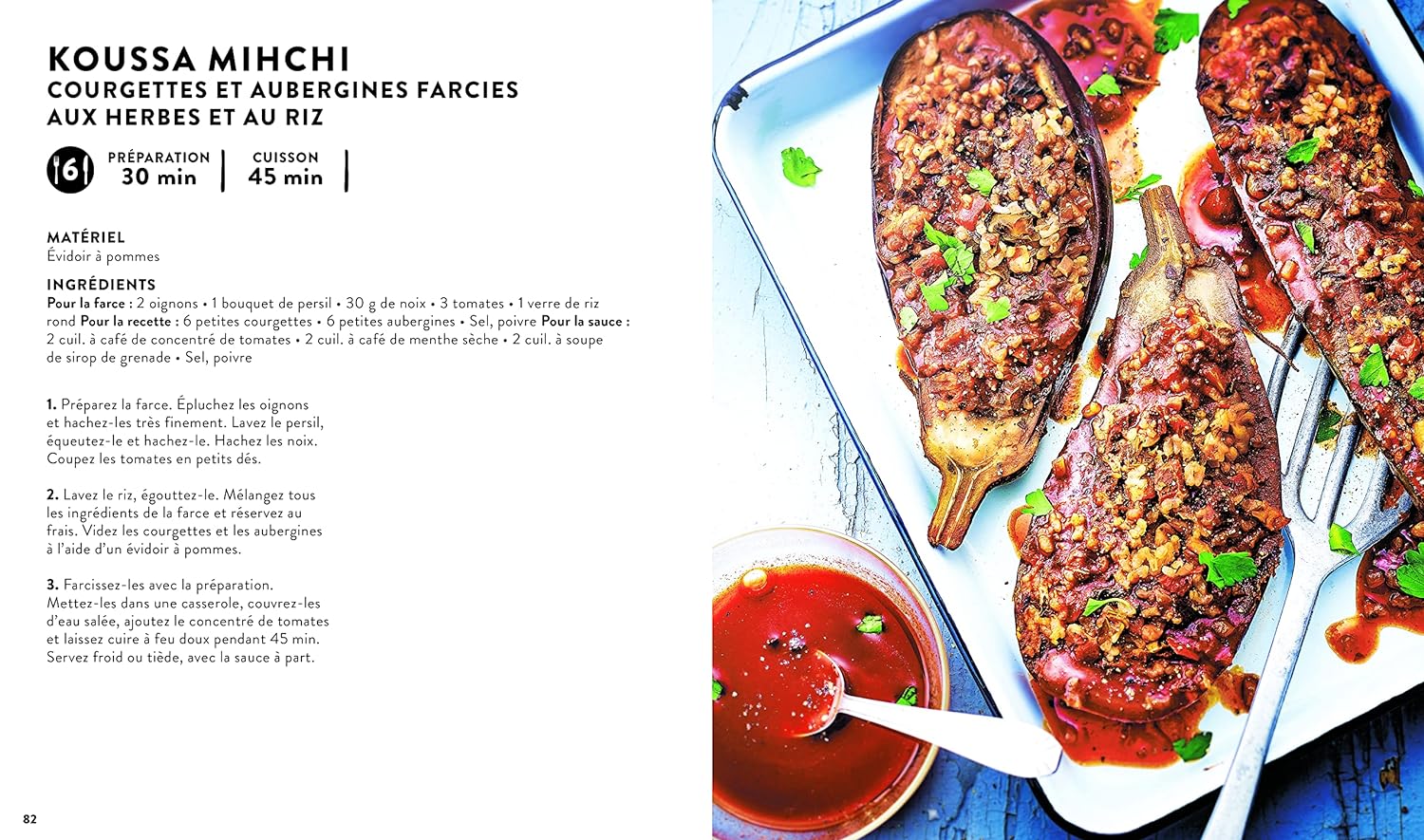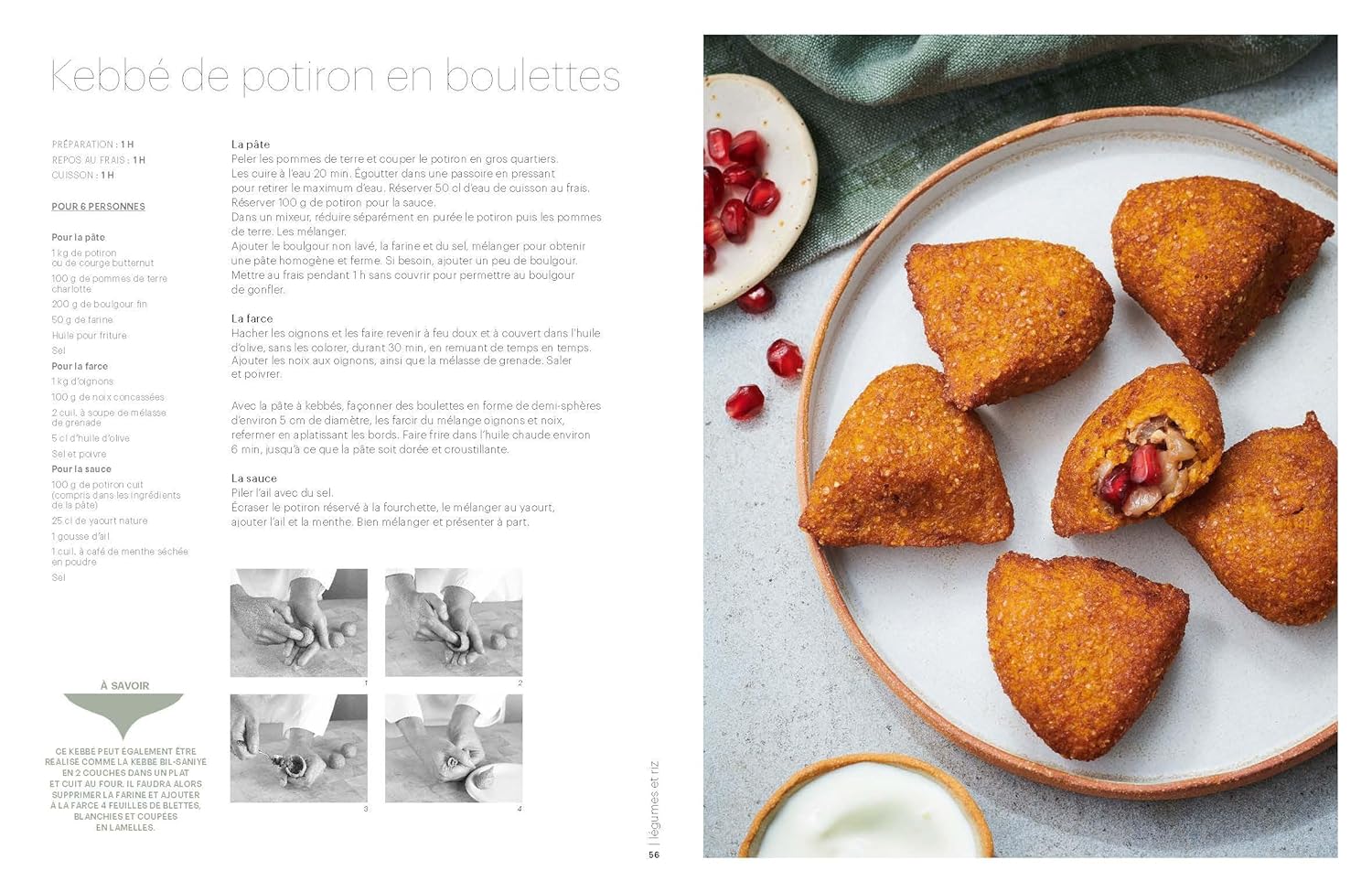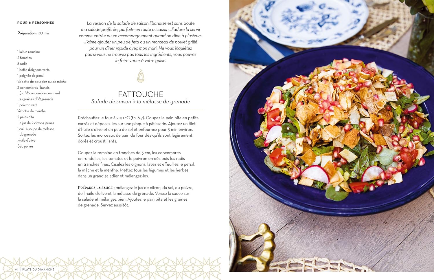 On y trouve les préparations de base (pâte à pain, riz aux vermicelles), les incontournables mezzés (taboulé, houmous), des salades originales (fattouch, salade de fèves), des options végétariennes alléchantes (falafels, hachis de potiron), des plats de viandes et poissons savoureux, et des desserts parfumés.