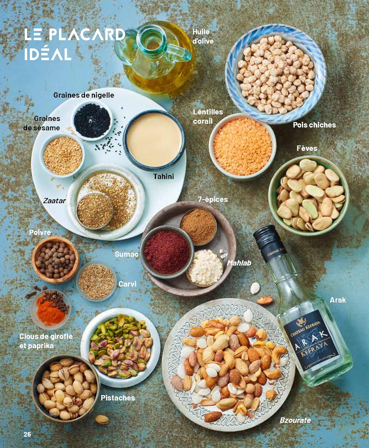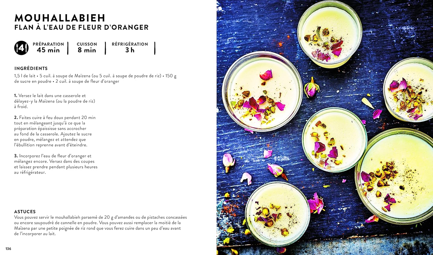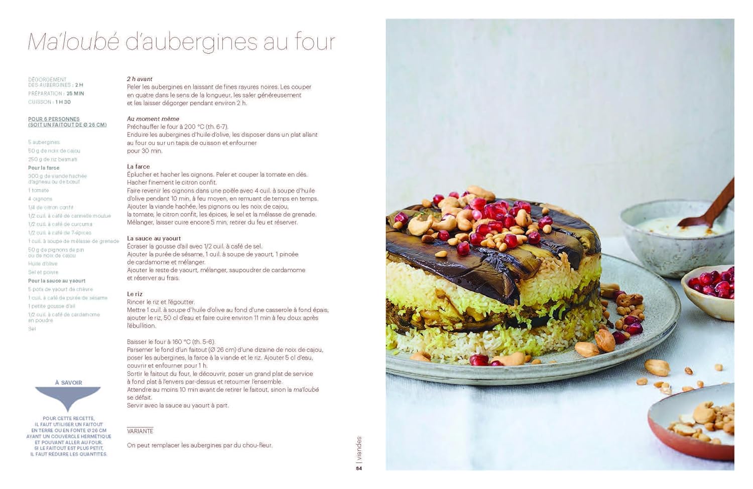 On y trouve les préparations de base (pâte à pain, riz aux vermicelles), les incontournables mezzés (taboulé, houmous), des salades originales (fattouch, salade de fèves), des options végétariennes alléchantes (falafels, hachis de potiron), des plats de viandes et poissons savoureux, et des desserts parfumés.