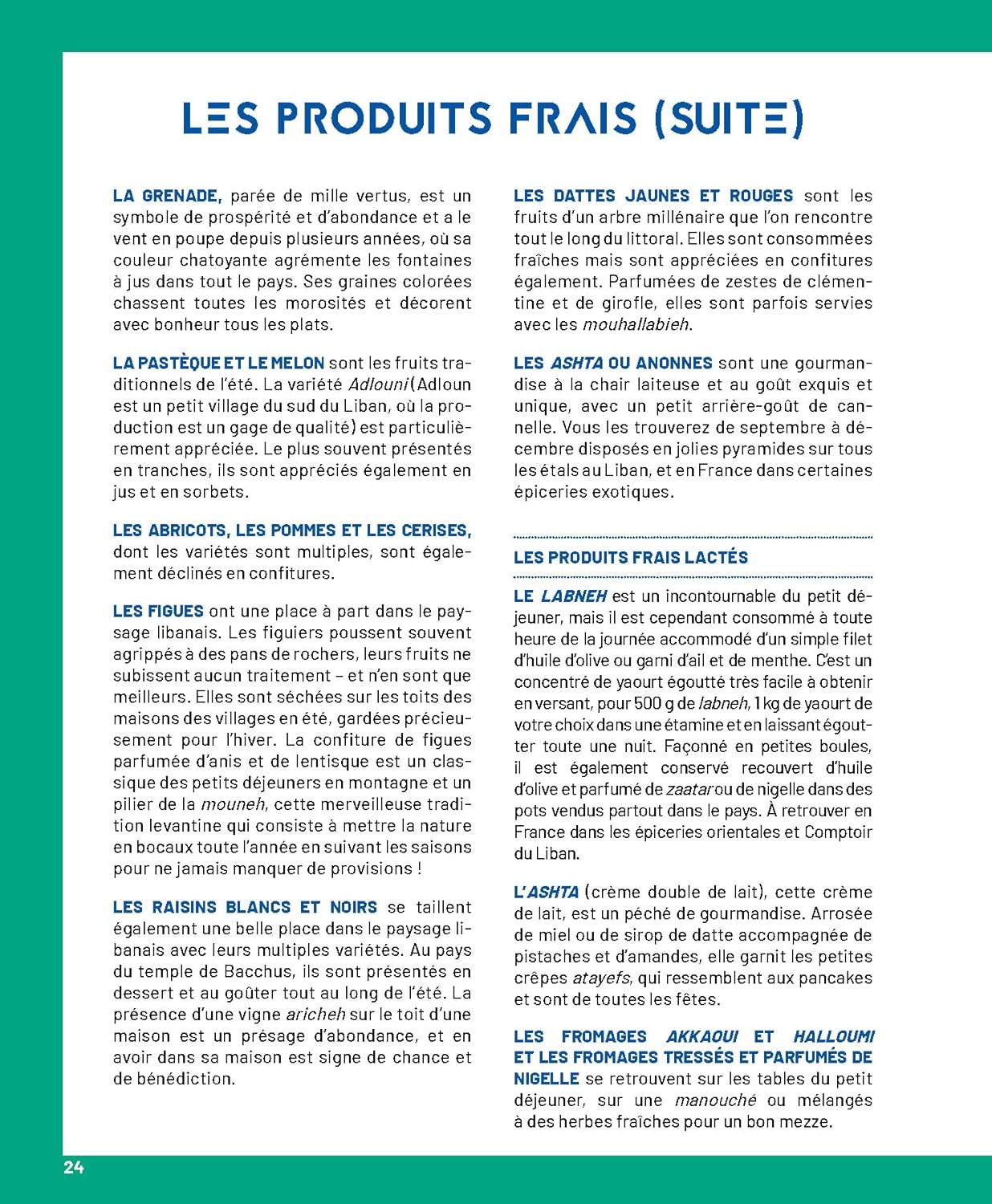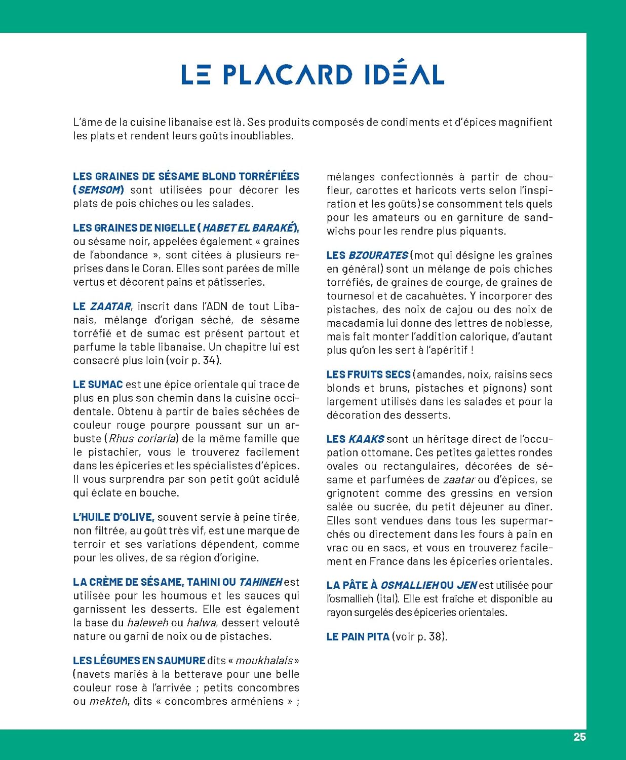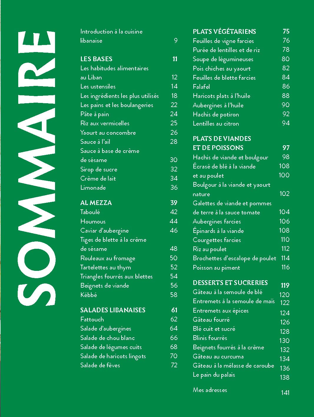 En plus des recettes, l’ouvrage vous présente les ingrédients de base nécessaires à la confection des plats, ainsi que des conseils et astuces pour réussir vos préparations. Vous y trouverez également des recettes de chefs invités, pour un aperçu des cuisines des restaurants libanais les plus raffinés au monde.