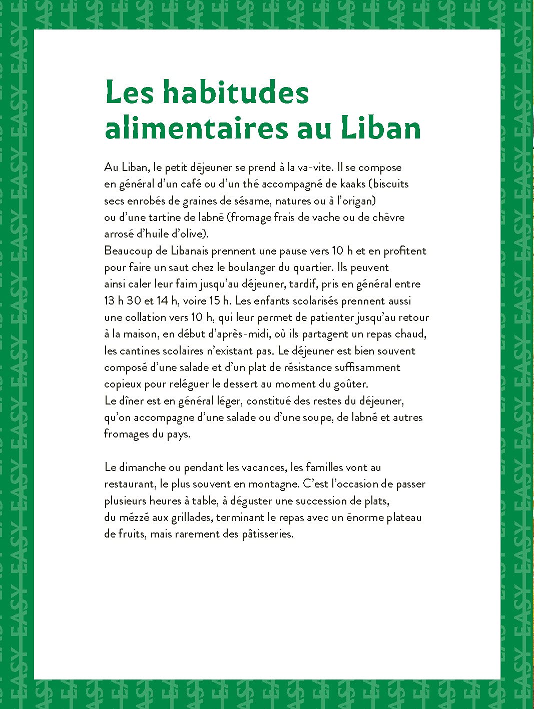 La cuisine libanaise est réputée pour sa variété unique de saveurs, de mets et de textures. Grâce à ce livre, vous pourrez facilement réaliser chez vous des plats traditionnels tels que le taboulé, le houmous, les falafels ou encore le chawarma. Alors, prêt(e) à vous régaler ?