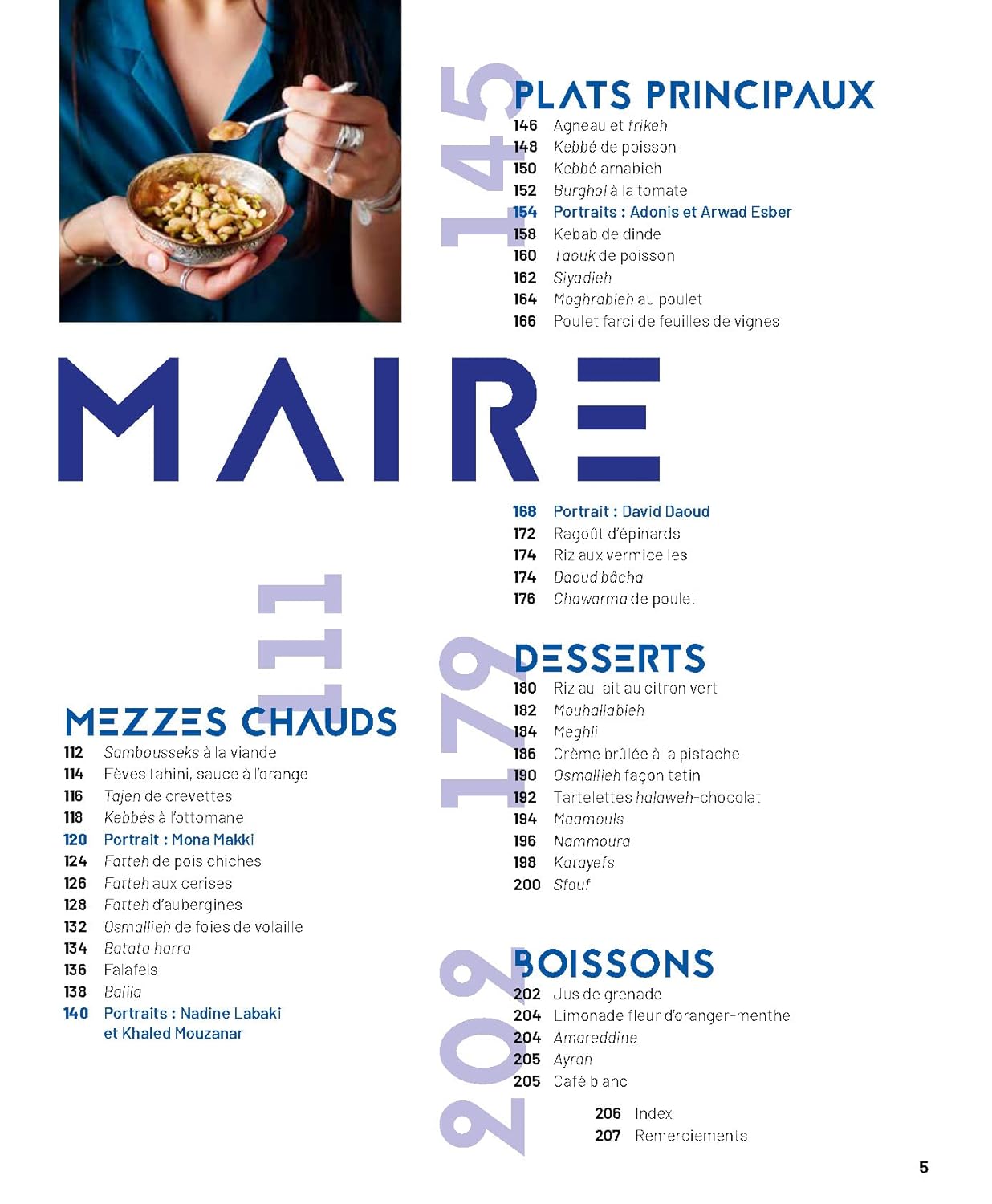 Andrée Maalouf et Karim Haïdar vous proposent 90 recettes inédites ou issues de leurs précédents ouvrages. Parmi elles, la mouhammara, les fatayers, le fatté de fèves aux épinards ou le harra’ osbo (lentilles au tamarin).
