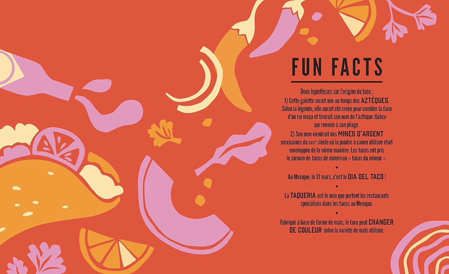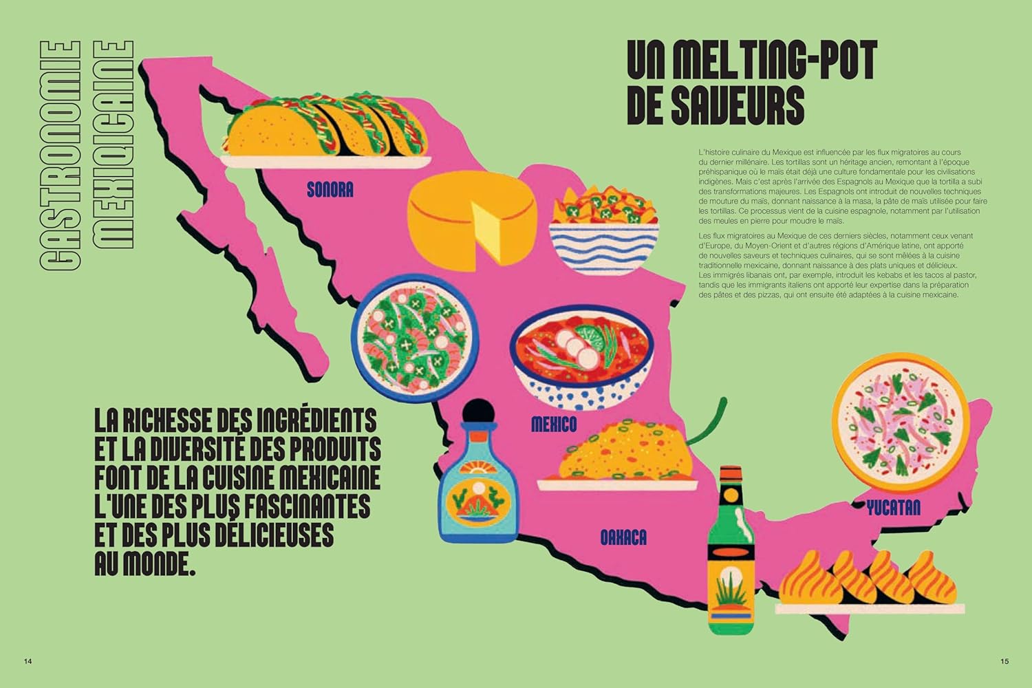 L’auteure présente des mets issus de diverses régions : la street food de Mexico, les spécialités de Oaxaca, les plats côtiers. Elle met aussi en lumière l’héritage culinaire des civilisations olmèque, aztèque et maya. Du mole au guacamole, en passant par les tlayudas (grandes tortillas garnies), chaque recette raconte une histoire. La gastronomie mexicaine vous réserve encore bien des surprises !