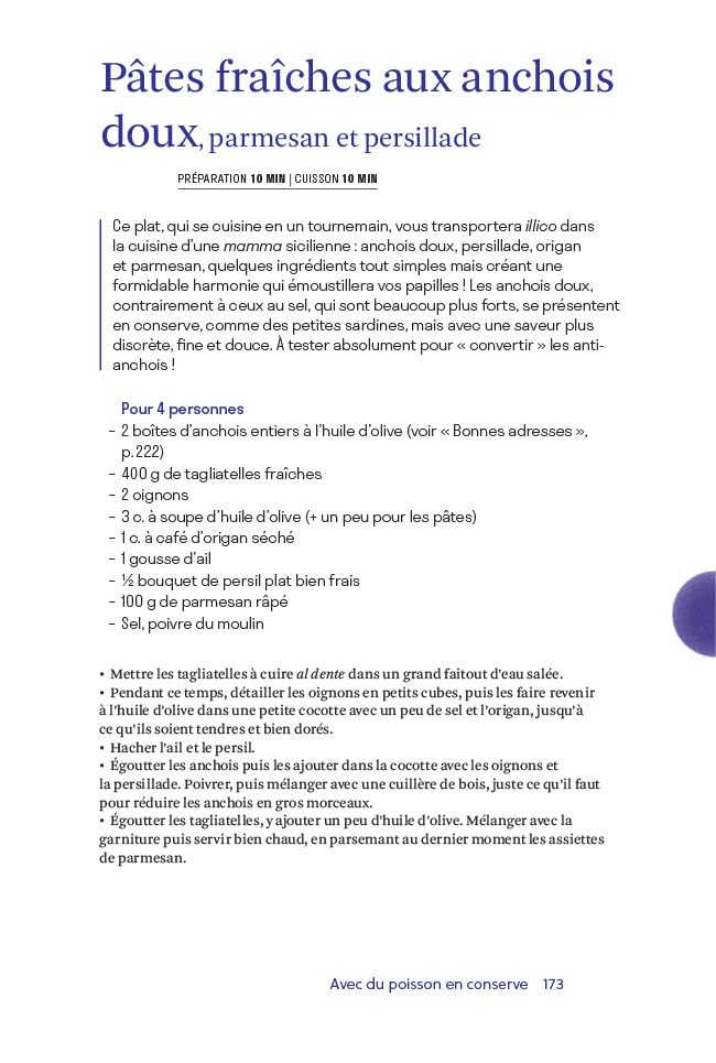 On y trouve une mine d’informations pour sélectionner et accommoder poissons, fruits et légumes de la mer. L’auteure, Marie Chioca, partage 100 recettes à la fois abordables et faciles à réaliser. Des pâtes fraîches aux anchois doux aux plats plus élaborés, il y en a pour tous les goûts.
