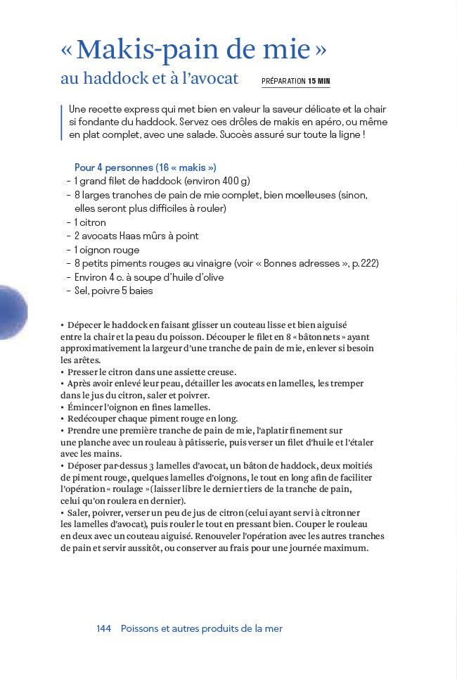 Le livre se divise en deux parties principales. La première nous apprend à identifier et préparer les produits de la mer. Comment reconnaître un bar frais ? Quelle est la meilleure technique pour écailler une daurade ?