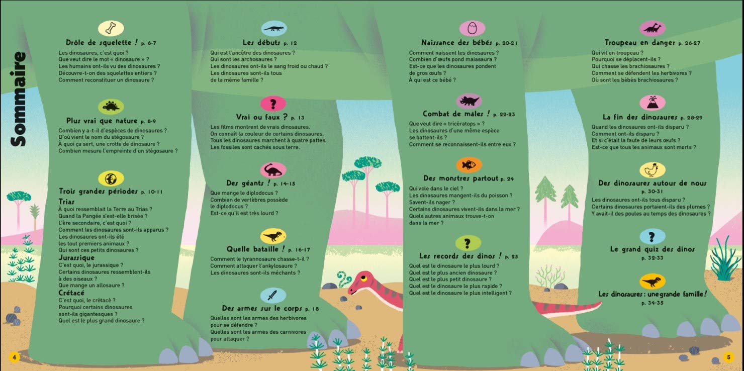 Anne-Sophie Baumann et Jean-Marie Poissenot répondent aux nombreuses questions que se posent les enfants sur des sujets tels que la disparition des dinosaures, la raison du long cou du diplodocus ou l’usage des trois cornes du tricératops. Le livre dévoile également la répartition des dinosaures aux quatre coins du monde et l’état de la Terre à l’époque. Un voyage inoubliable à l’ère des géants !
