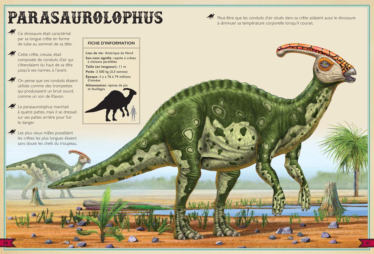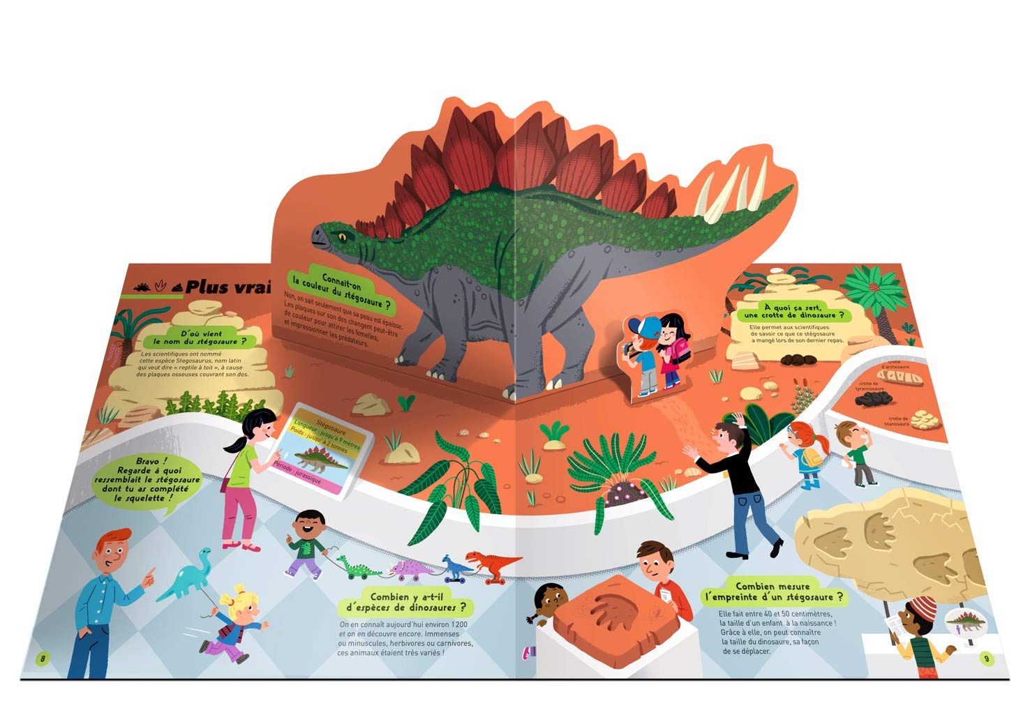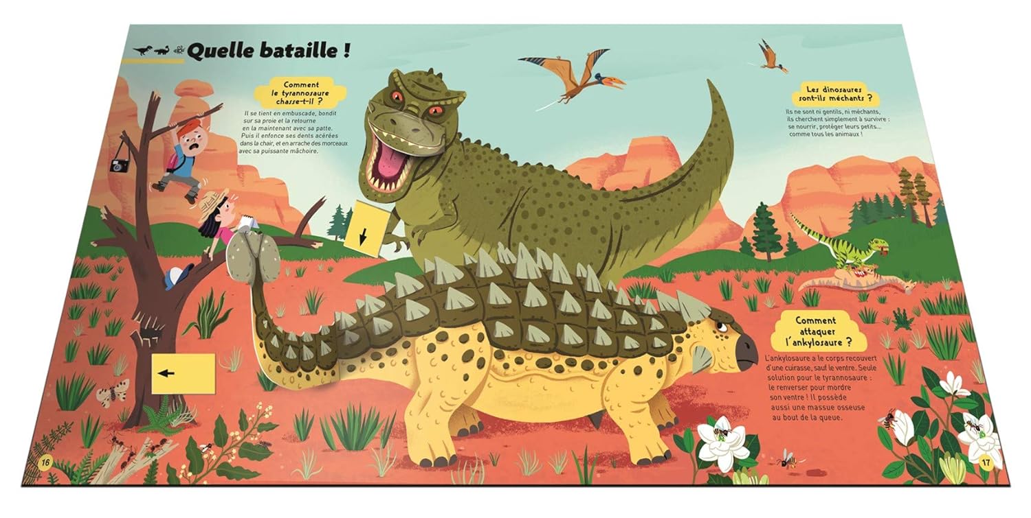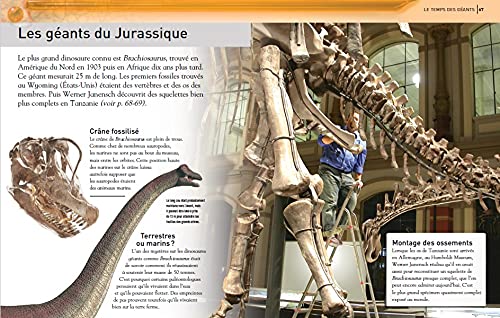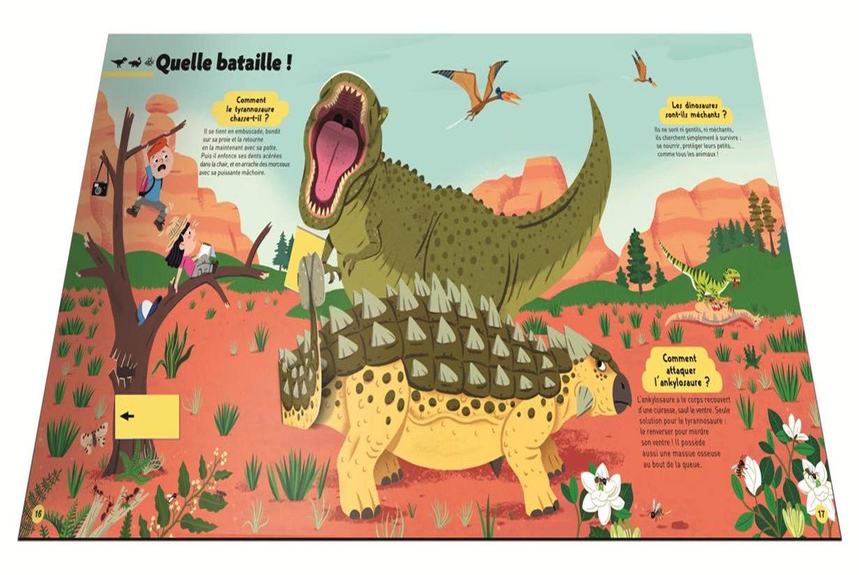 Un livre qui propose de se glisser dans la peau d’un paléontologue et de manipuler des os pour reconstituer le squelette d’un stégosaure. Des pop-up illustrent un duel de tricératops ou révèlent les prémices de l’ère glaciaire. Une grande page dépliante expose toutes les familles de dinosaures. Au détour des pages, une roue évolutive, des languettes à tirer, des rabats et d’autres surprises attendent les petits lecteurs.