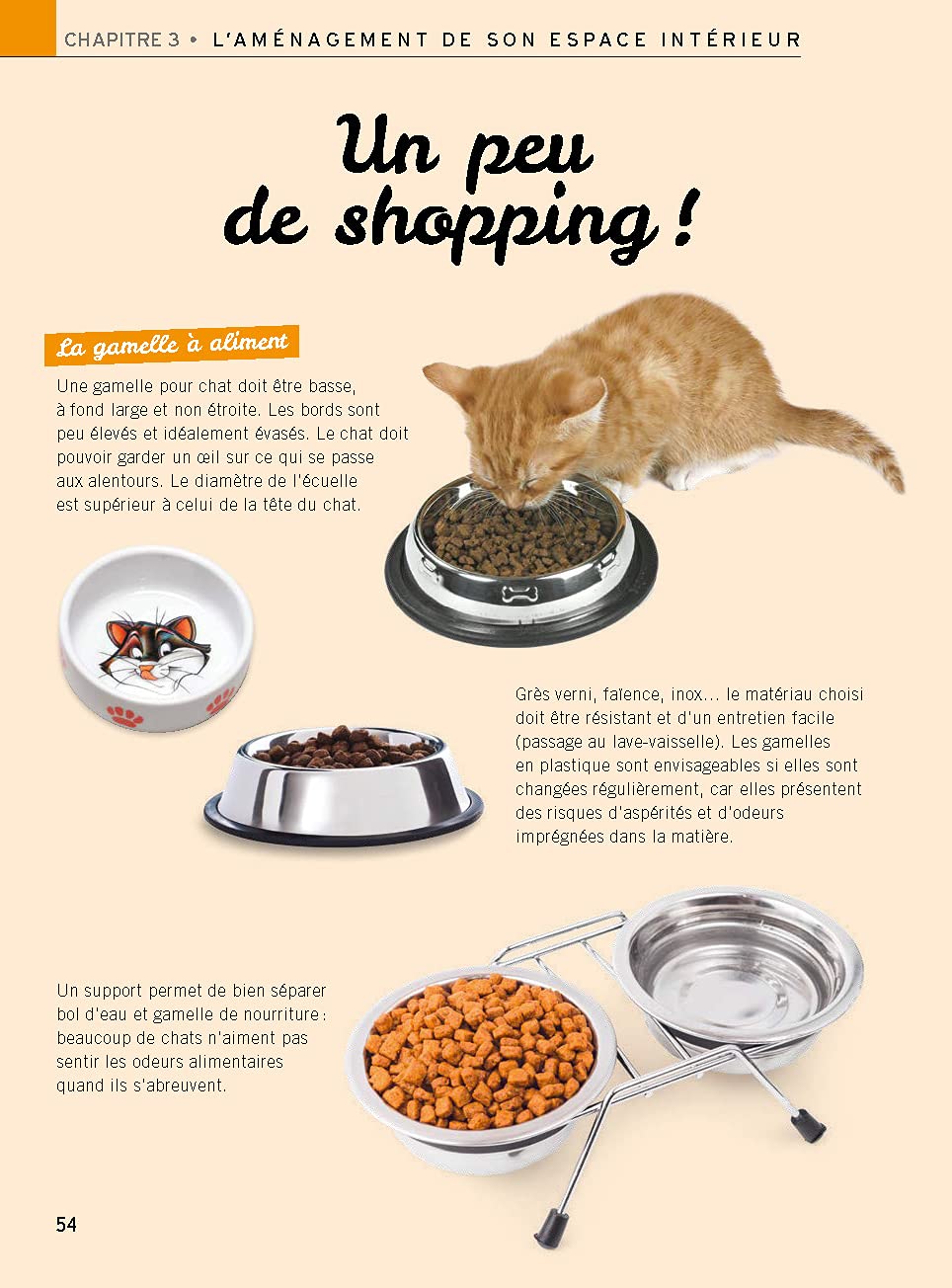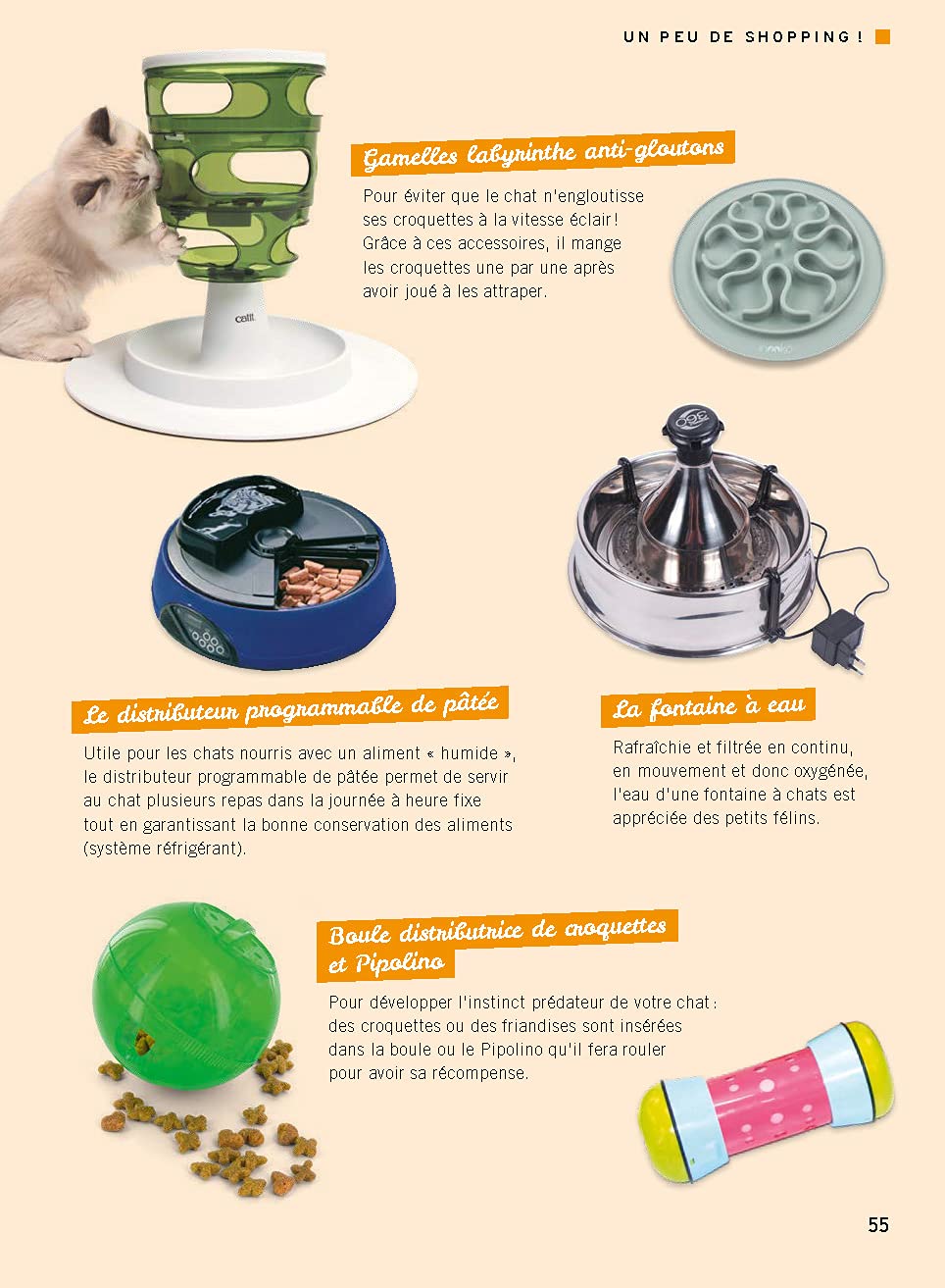 Et pour vous donner des idées, l’auteur a sélectionné pour vous de nombreux accessoires, des plus simples aux pus inattendus : bacs à litière, hamacs de radiateur, fontaines à eau, arbres à chat, griffoirs, balles de jeu…