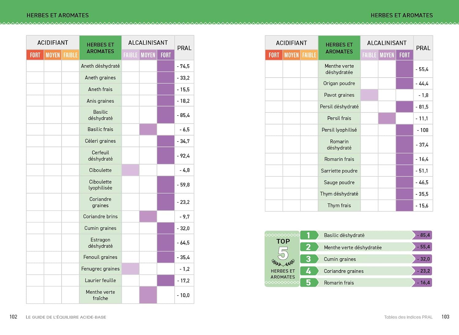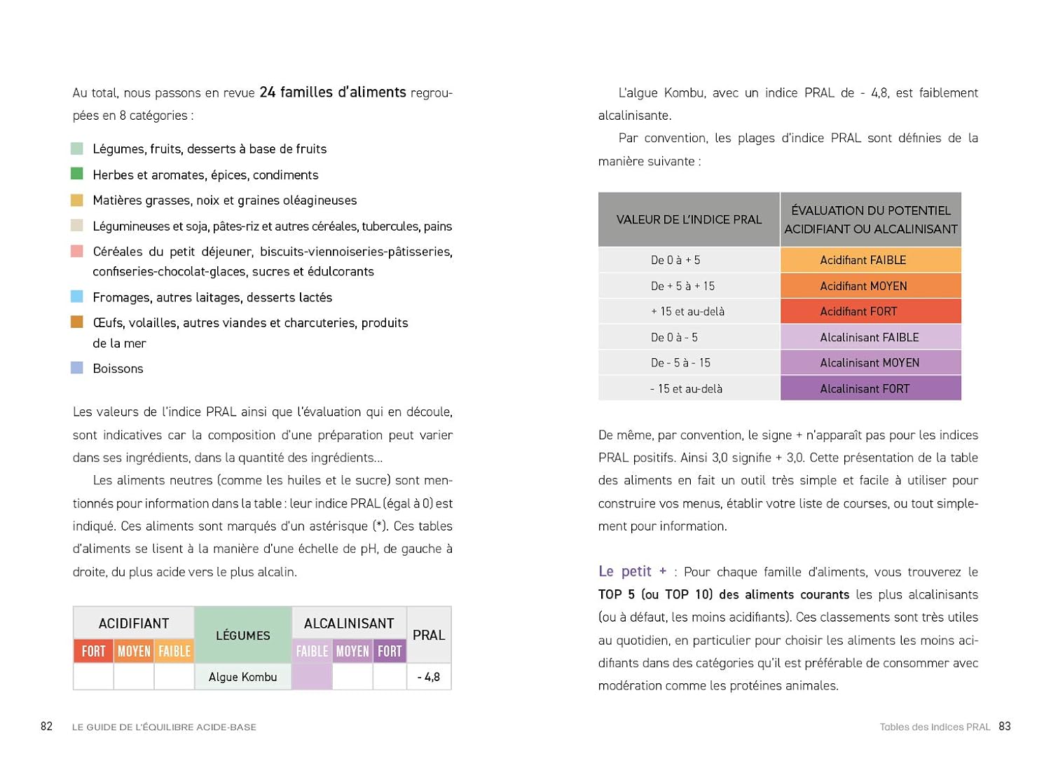 Pour cela, vous avez à portée de main le potentiel acidifiant ou basifiant (indice PRAL) de près de 900 aliments et plats préparés. En un clin d’œil vous pourrez identifier ceux qui sont les plus favorables à votre santé et ceux qu’il convient de limiter. Vous apprendrez aussi – et c’est une première – à composer un menu basifiant presque idéal.