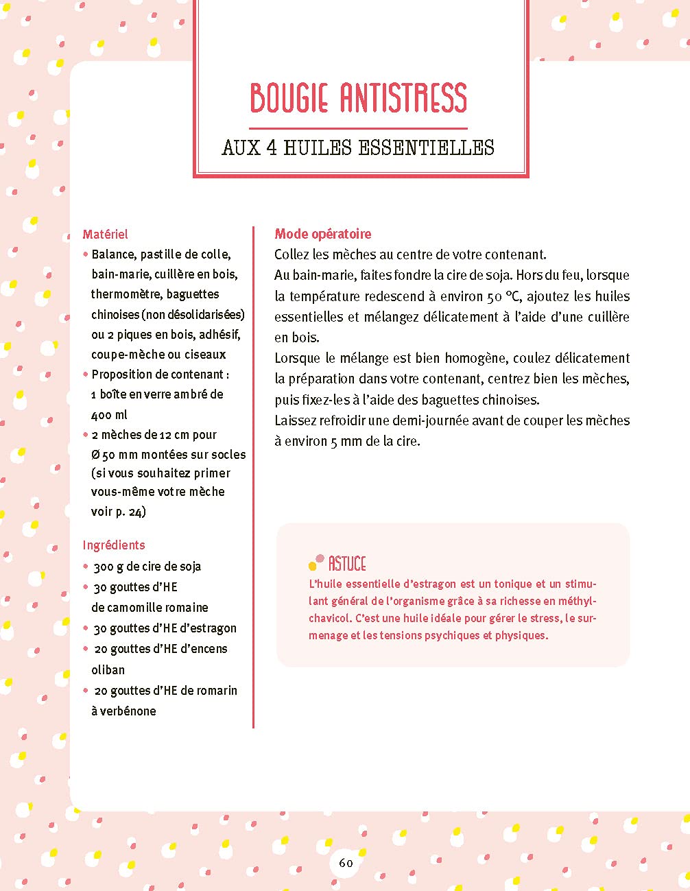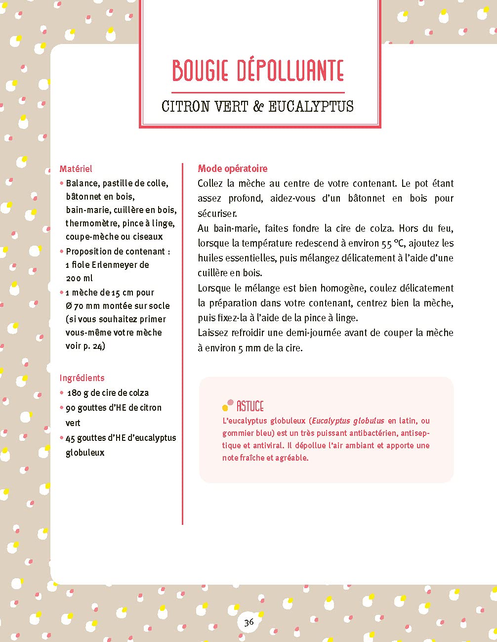 Ces manuels pratiques sont justement conçus pour vous apprendre à composer vos propres bougies en privilégiant les ingrédients naturels (mèches, cires végétales, huiles végétales, beurres végétaux, huiles essentielles, etc.) et un minimum de matériel.