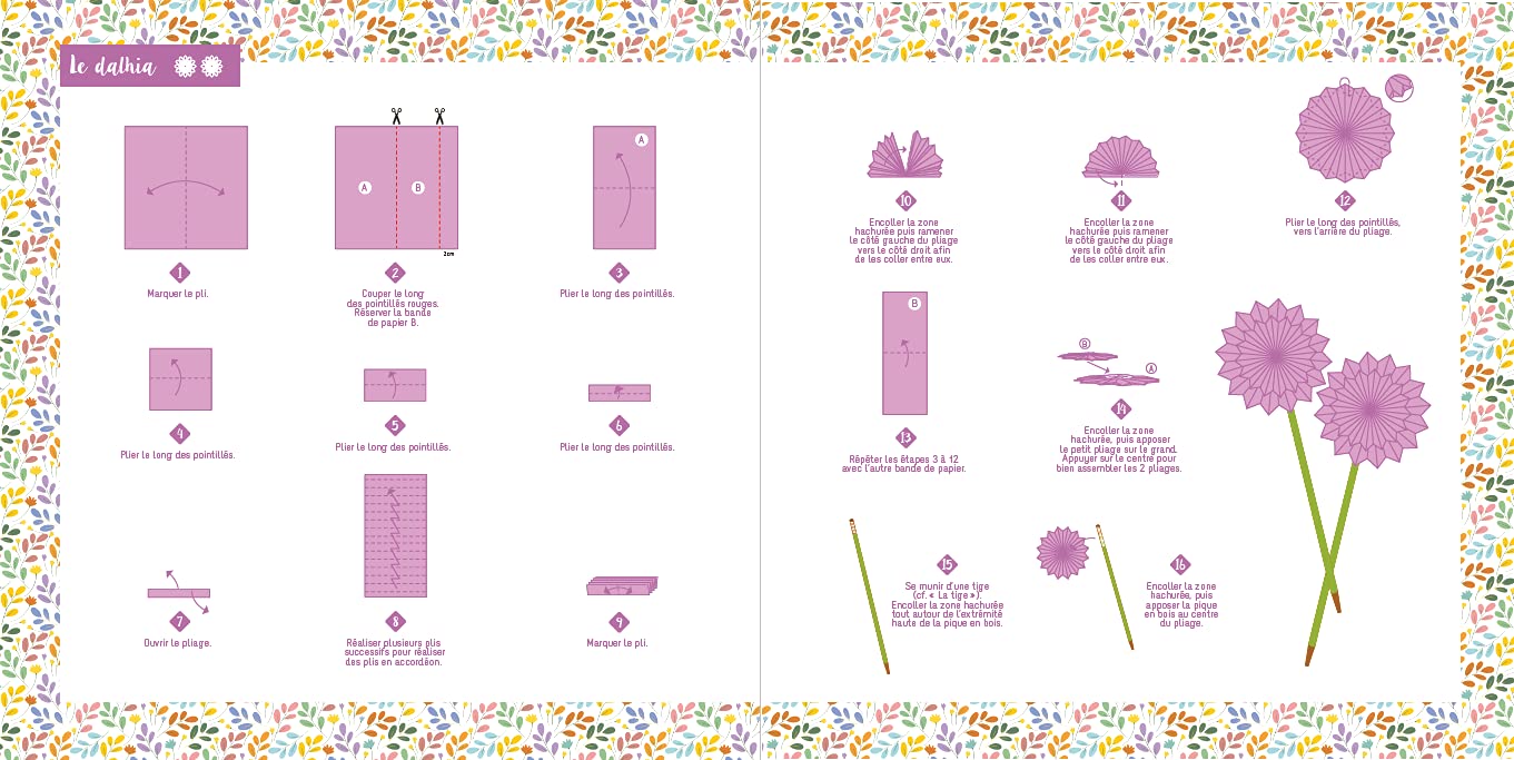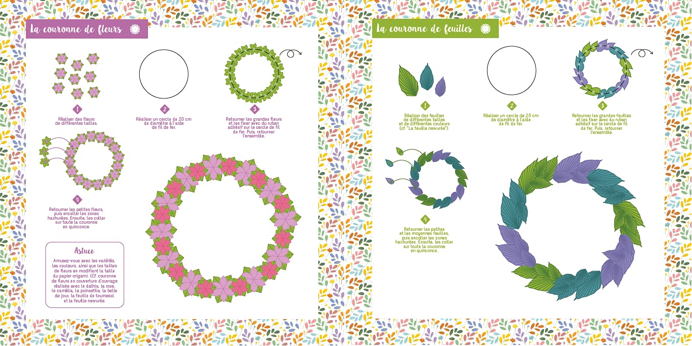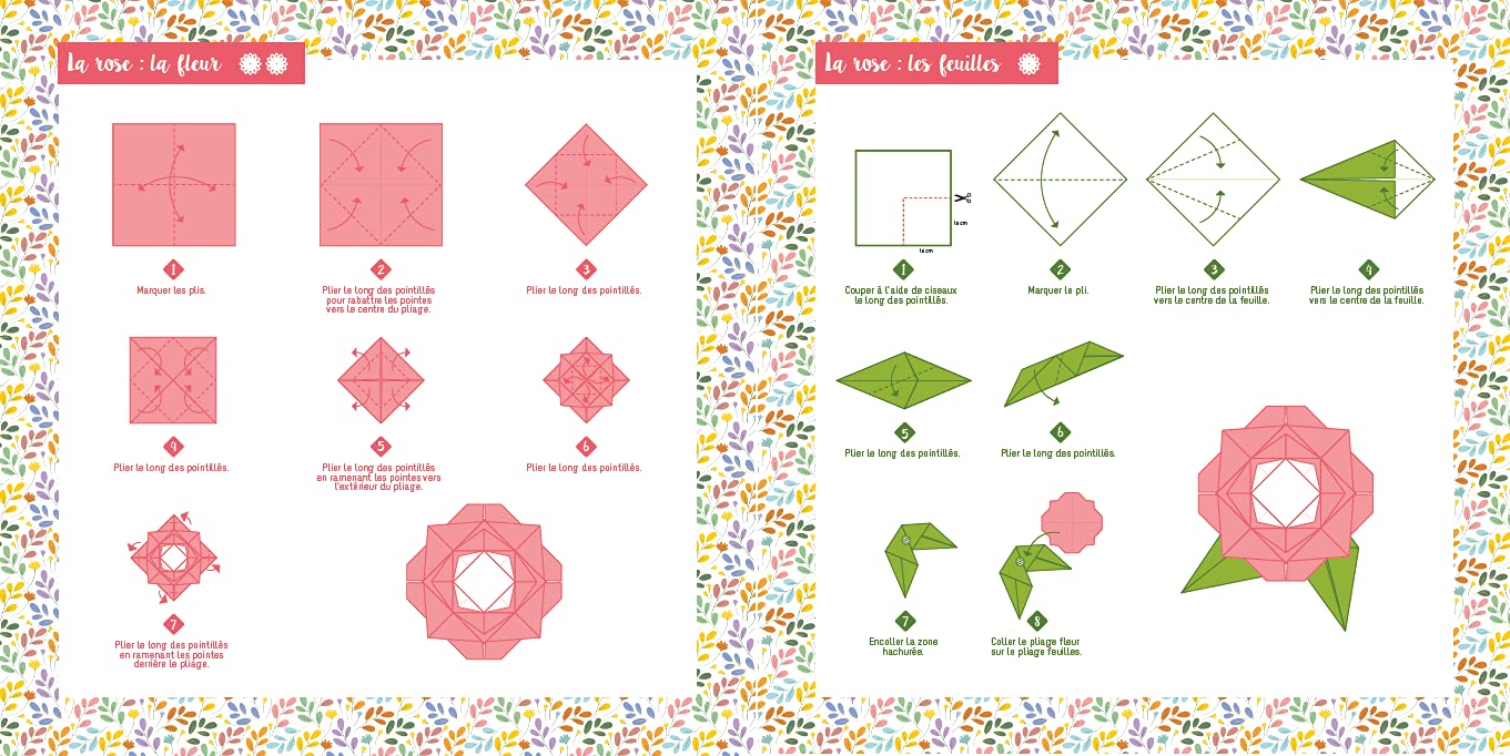 - 25 modèles de pliages expliqués en pas à pas : tulipe, arum, dahlia, lys, œillet, iris, rose, camélia, hortensia, poinsettia, belle de jour, tournesol, tiges et feuilles, couronne de fleur, couronne de feuilles nervurées.