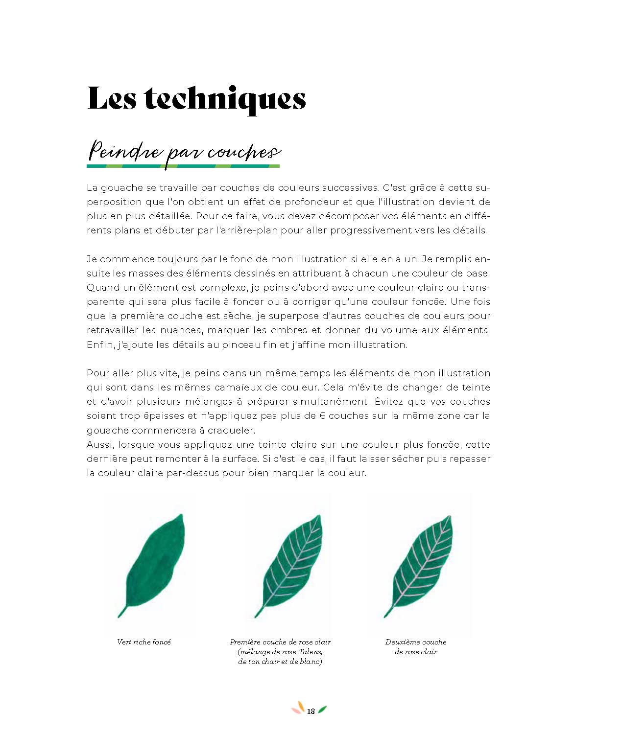 Vous passerez ensuite de la feuille au volume, du motif à l’objet grâce aux dernières parties de l’ouvrage : guirlande décorative, cadre ou papier cadeau personnalisés, etc. Quatre créatrices internationales vous livreront leur savoir-faire pour marier la gouache à d’autres disciplines et ainsi réaliser un carnet, un tablier décoré en punch needle, une mosaïque wax et une pochette en cuir.