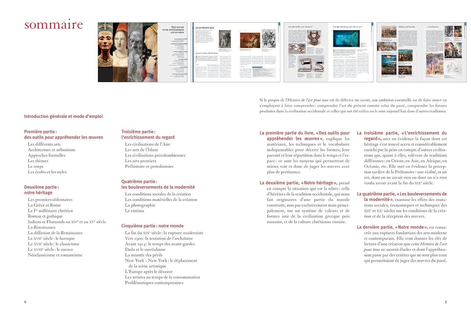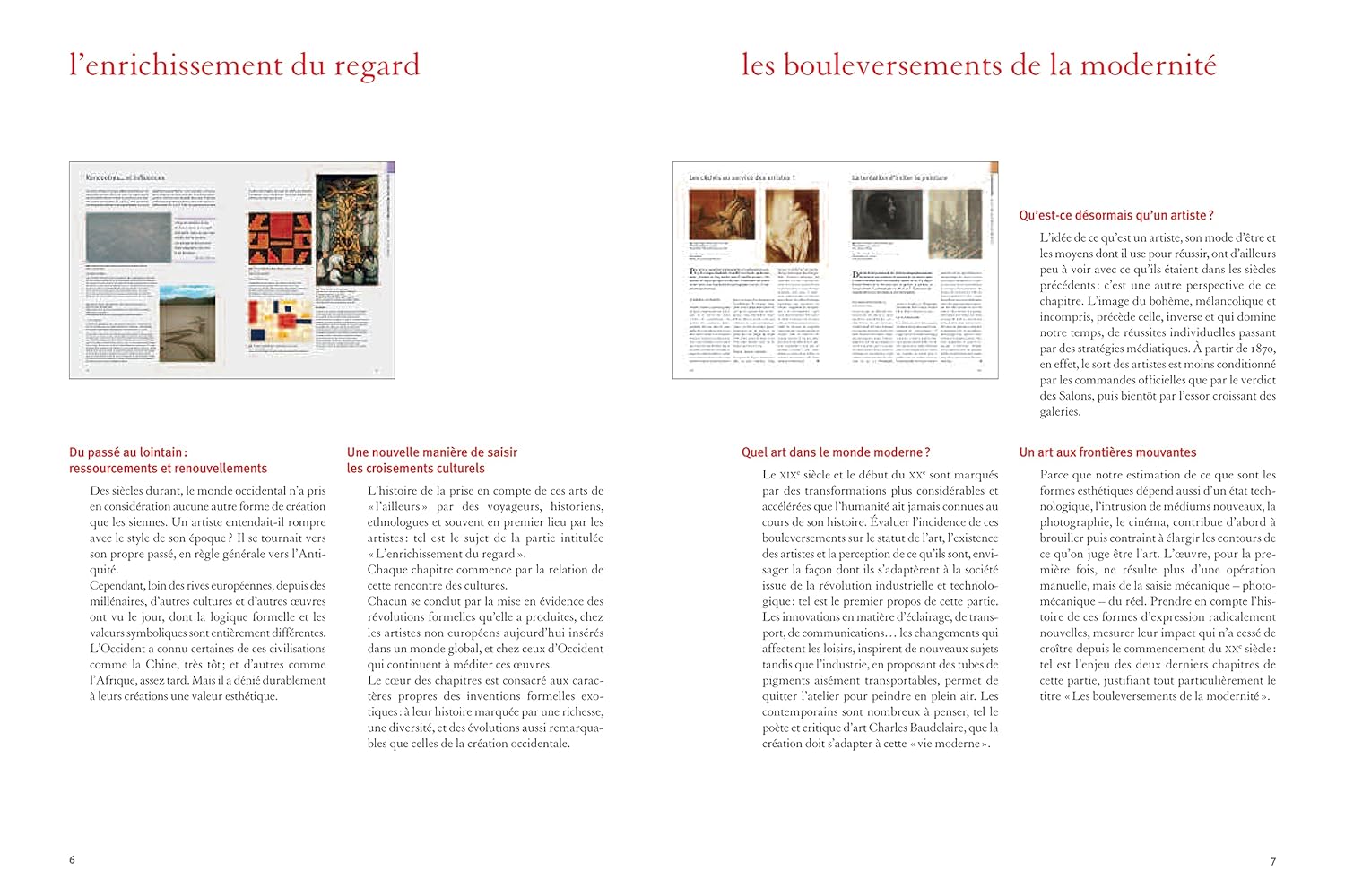 Ce livre se revendique comme une synthèse. Il invite le lecteur à découvrir à la fois les grandes fonctions de l’art, mais aussi la diversité des formes possibles de la création et les corrélations qui peuvent les unir. Enrichir le regard : un dispositif concerté permet des allers et retours entre le texte, les commentaires et les images, tout au long de l’ouvrage.