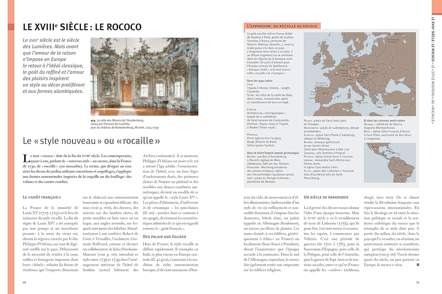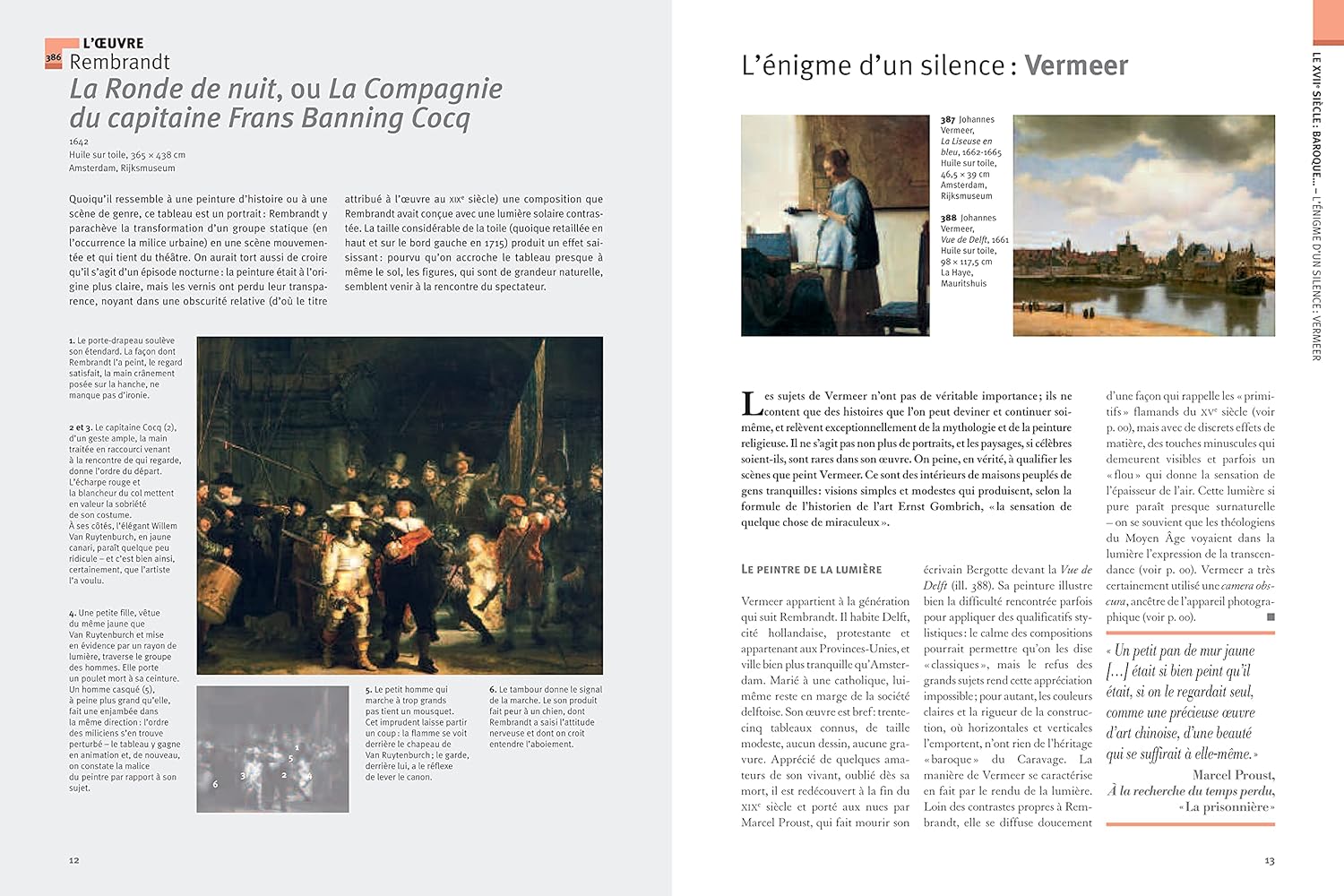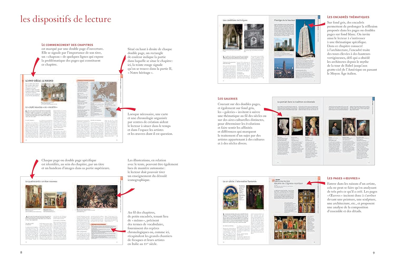 Au début de chaque période, une grande frise chronologique. Au fil des doubles pages, la présentation de chaque œuvre, l’accent étant mis selon le cas sur sa forme, sa signification, sa réception… À intervalles réguliers, des dossiers sur des problématiques transversales ou des genres majeurs de la période considérée.