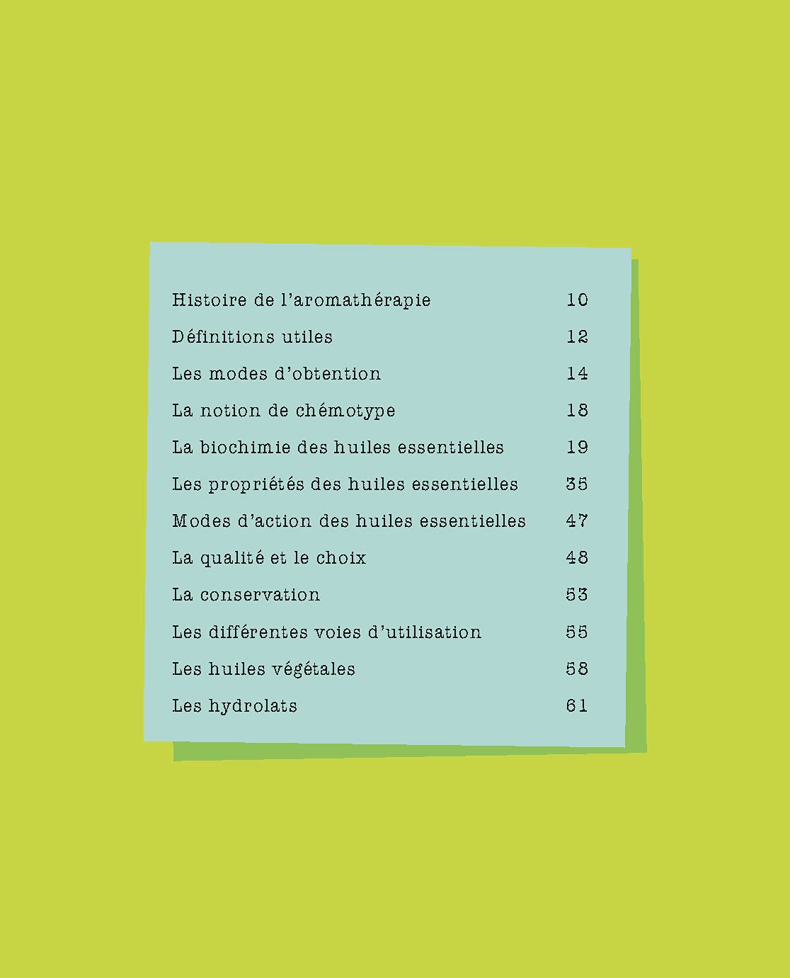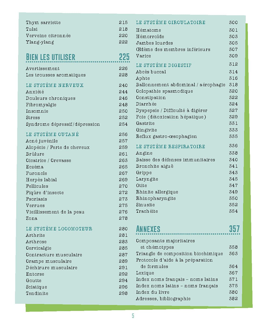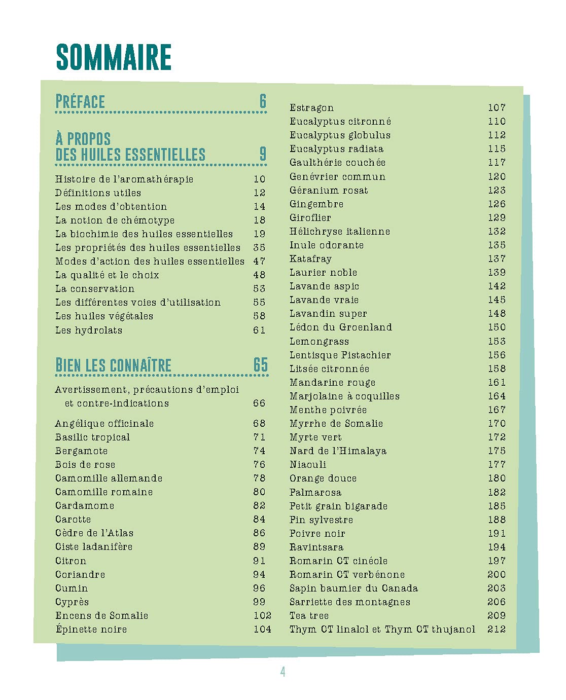 - Approche par huile essentielle : 44 huiles essentielles incontournables et accessibles financièrement ; 91 huiles essentielles moins courantes, mais tout aussi efficaces, pour se constituer une pharmacie familiale. L’accent est mis sur les huiles essentielles bio, critère de choix indispensable, mais aussi sur une approche écoresponsable, certaines huiles essentielles étant tirées de plantes dont la ressource se fait rare, du fait d’une surexploitation.