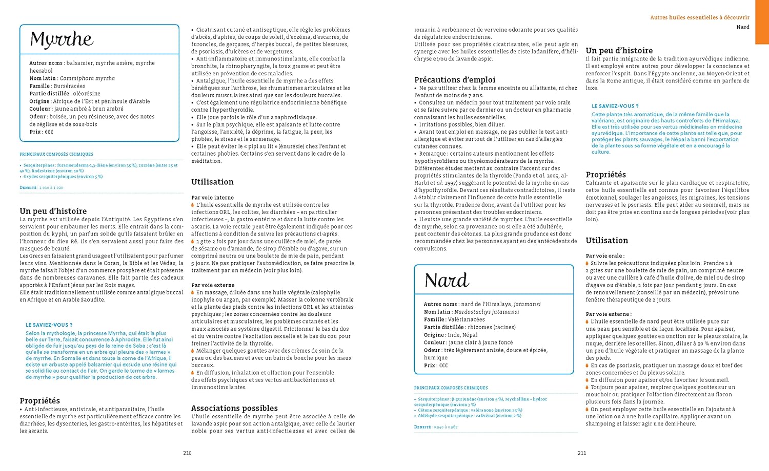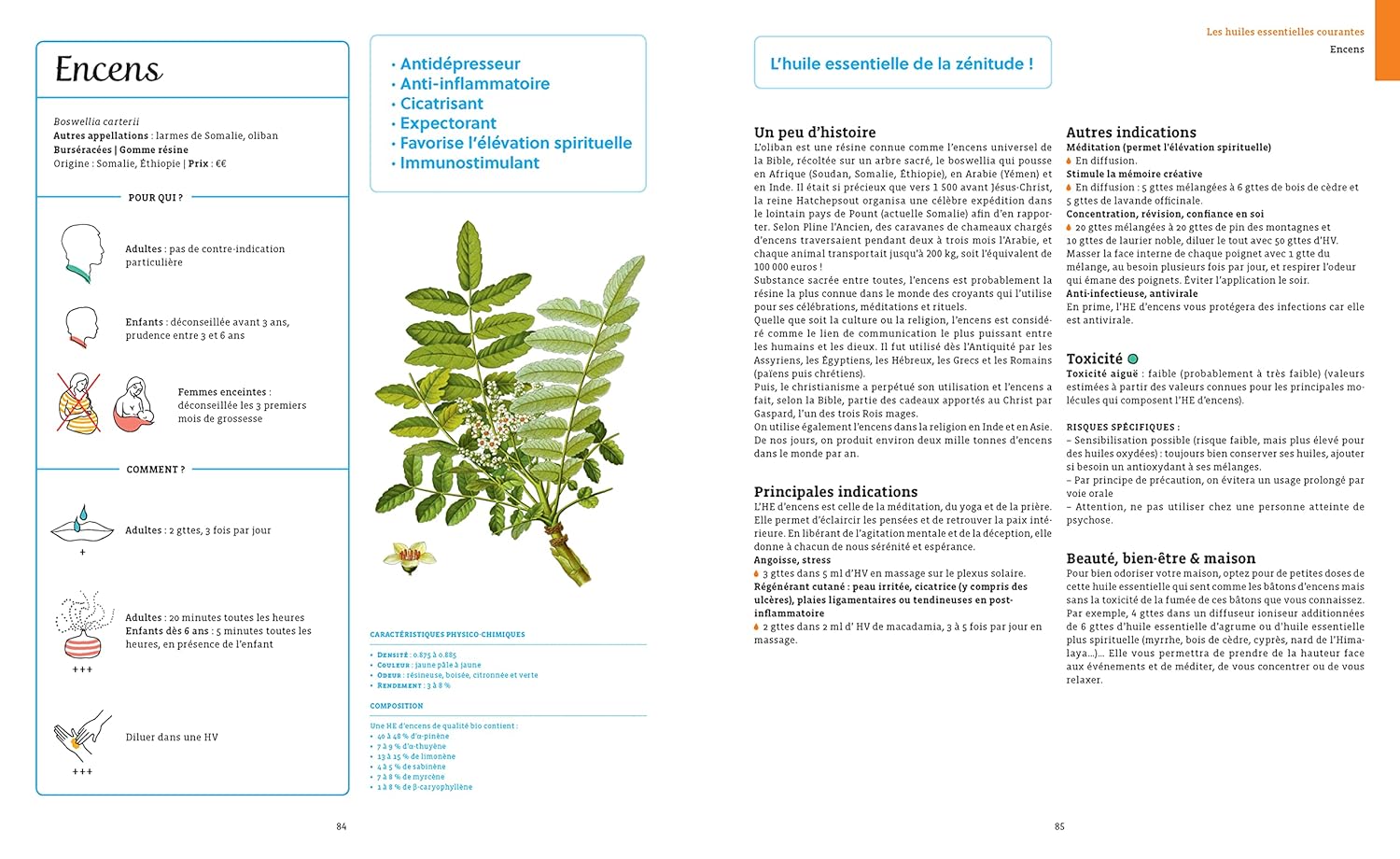 - Des conseils beauté/bien-être (peau, cheveux, corps, ongles, etc.), ainsi que quelques recettes pour utiliser (avec parcimonie !) les huiles essentielles en cuisine et pour la maison sont également donnés.