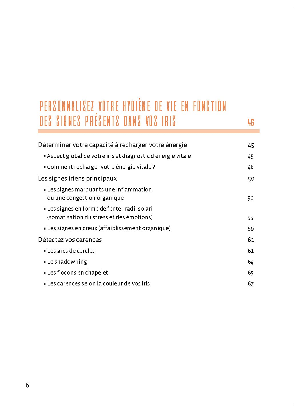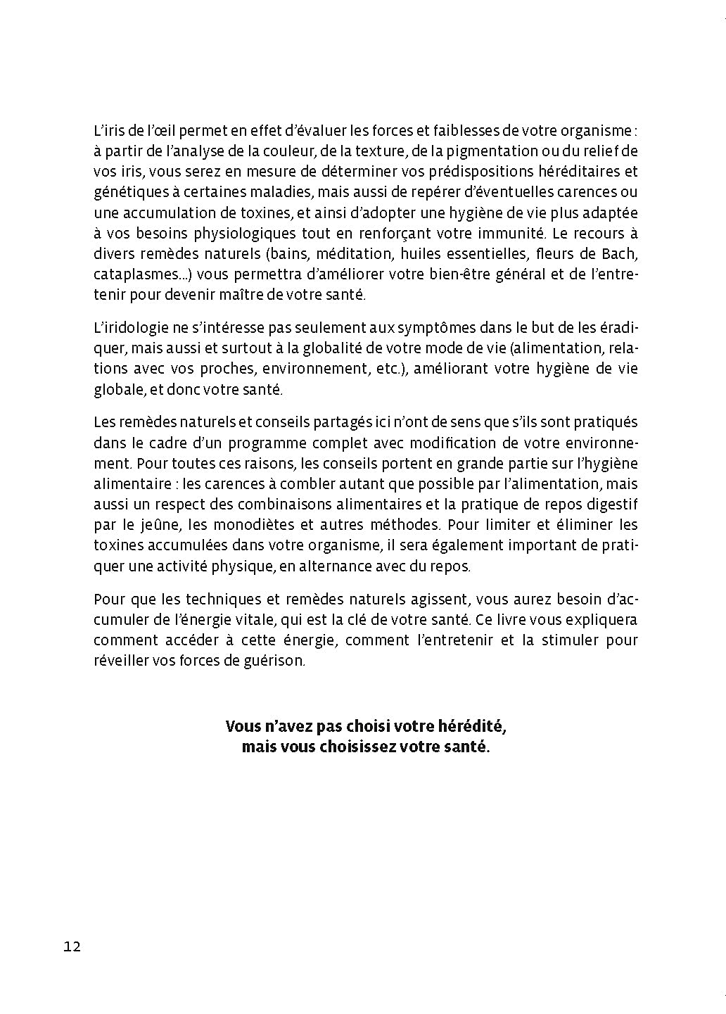 L’iridologie de terrain détermine ainsi trois grandes phases évolutives iriennes : la phase d’identification du terrain individuel ; la phase toxinique due à un encrassement humoro-cellulaire ; la phase gérontoxale correspondant au vieillissement de l’organisme. Chaque lecteur de cet ouvrage initiatique pourra déterminer sa propre phase évolutive, afin de remédier, en connaissance de cause, à ses facteurs de mal-être personnels.