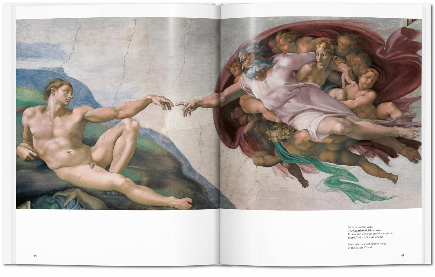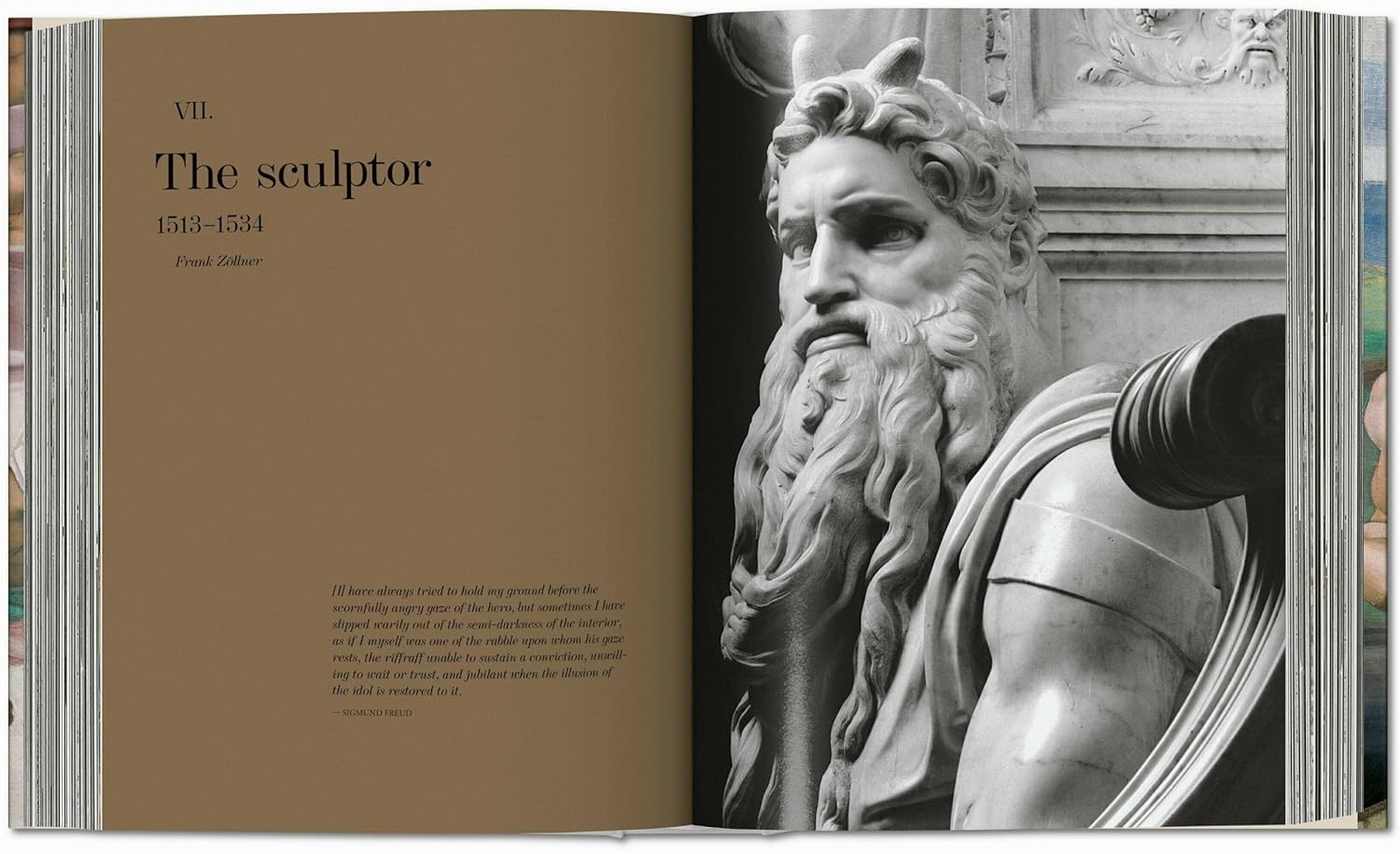 Ce livre très complet explore la vie et l’œuvre de Michel-Ange à travers un essai biographique abondamment illustré et un inventaire exhaustif en quatre parties de ses tableaux, sculptures, créations architecturales et dessins. Des reproductions pleine page et des agrandissements permettent au lecteur d’accéder aux moindres détails du vaste répertoire de l’artiste, alors que l’approche biographique du livre s’attache de manière inédite à la personnalité et à des aspects plus intimes de la vie de Michel-Ange, comme sa nature solitaire, sa soif d’argent et de commandes, son immense fortune et son talent d’investisseur.