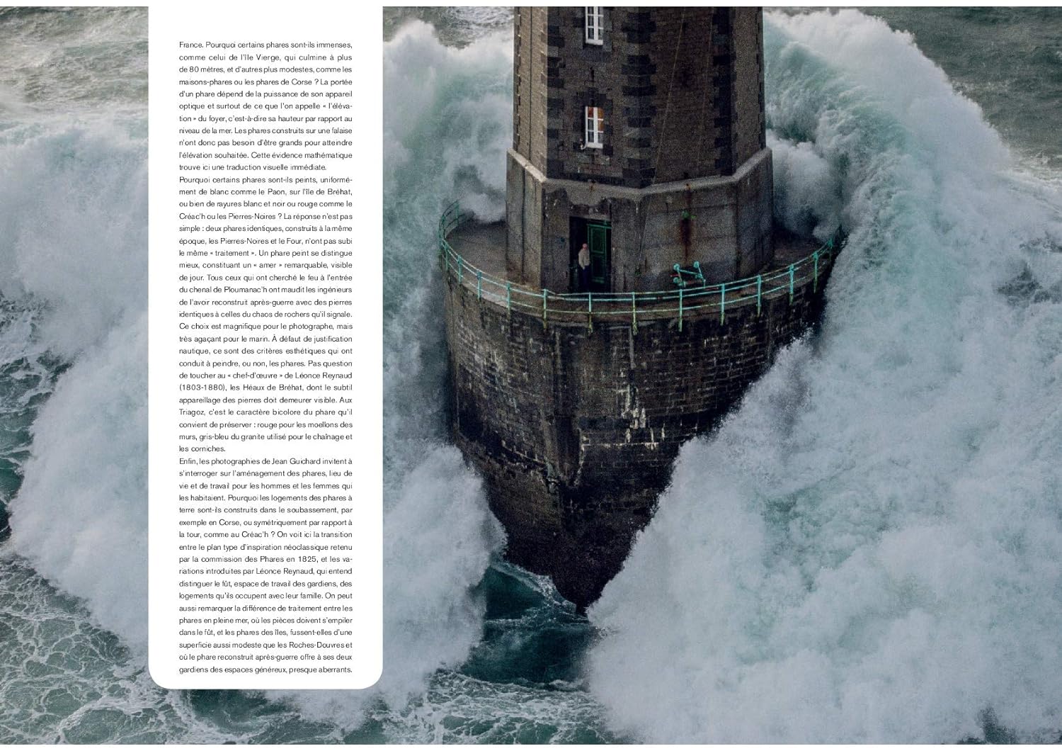 Un beau livre de photos par un reporter spécialiste des phares : Jean Guichard (sa photo du gardien du phare de la Jument dans la tempête de 1989 a été reproduite à plus d’un million d’exemplaires). Des reportages réalisés dans des conditions parfois périlleuses (en hélicoptère dans la tempête). Un texte historique et descriptif pour chaque phare, écrit par un autre spécialiste incontournable : Jean-Christophe Fichou.