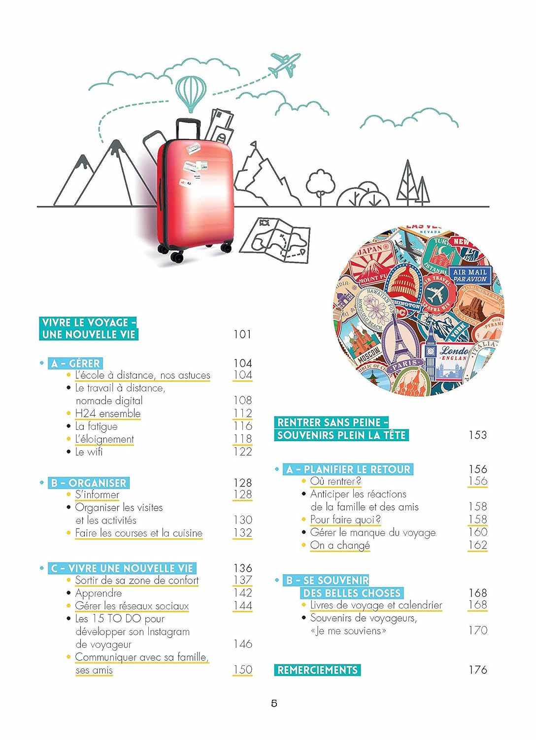 Le guide est divisé en 5 grands chapitres : 1) Préparer son départ ; 2) Se déplacer ; 3) Se nourrir ; 4) Se loger ; 5) Sécurité et santé. Les chapitres fourmillent d’informations pratiques sur tout ce qui touche au voyage : documents et formalités administratives, argent et travail, préparer ses bagages de façon optimale, camper en milieu naturel, cuisiner sur la route, loger chez l’habitant, voyager à vélo, utiliser le covoiturage, faire de l’avion-stop, voyager en cargo…
