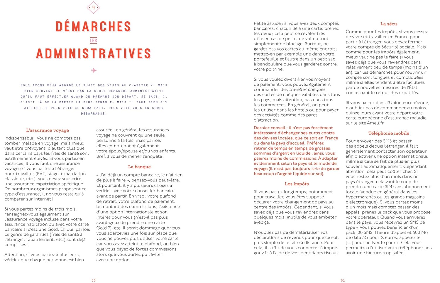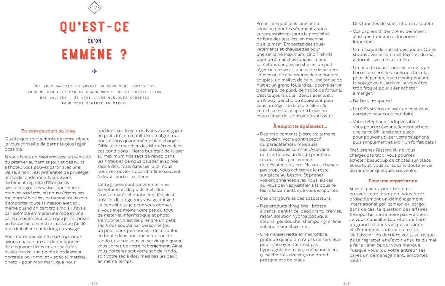 Des conseils pour se débrouiller partout et dans n’importe quelle situation. Par terre, par mer ou par air, tous les moyens de transport passés au crible. Des témoignages des auteurs baroudeurs pour illustrer leurs propos. Des sections spécifiques : le voyage au féminin, le voyage en famille ou à plusieurs, filmer son voyage, le nomadisme digital et le travail en voyage, comment réduire son impact écologique, la communication interculturelle, le choc culturel…