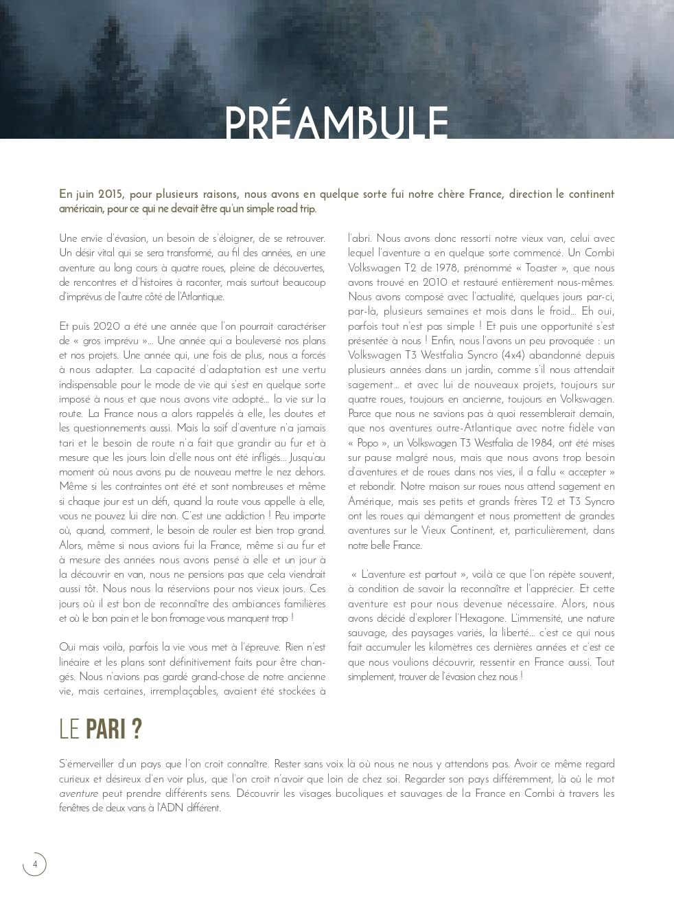 Dans ce livre, ils partagent leurs itinéraires et leurs découvertes, espérées ou inattendues, après une année passée à sillonner le pays. Ils offrent également des conseils techniques et pratiques pour tous ceux qui voudraient, à leur tour, se lancer dans une aventure en van. Amateurs de voyages et de grands espaces, la France par la route s’offre à vous, jalonnée de paysages à contempler, de randonnées, et de coins paisibles à débusquer.