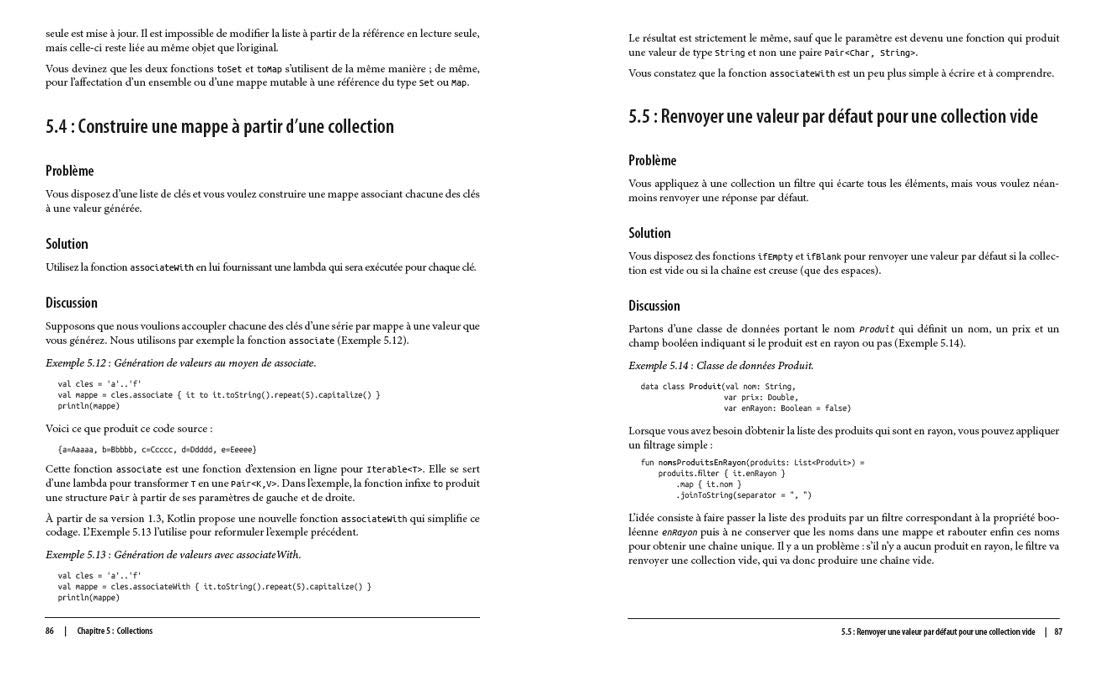 Une troisième partie donne la possibilité de progresser dans son apprentissage de la programmation avec Kotlin en se familiarisant avec des notions avancées contenues directement dans le langage (conversion de type, réification de type, fonctions de portée…), avant de poursuivre avec une partie dédiée aux collections.