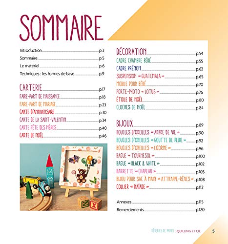 Le quilling est une technique de pliage du papier à partir de fine bandelettes, enroulées sur elles-mêmes et fixées sur un support. L’autrice propose donc de réaliser des créations « utiles » réparties en trois univers : la carterie, la décoration et les bijoux.