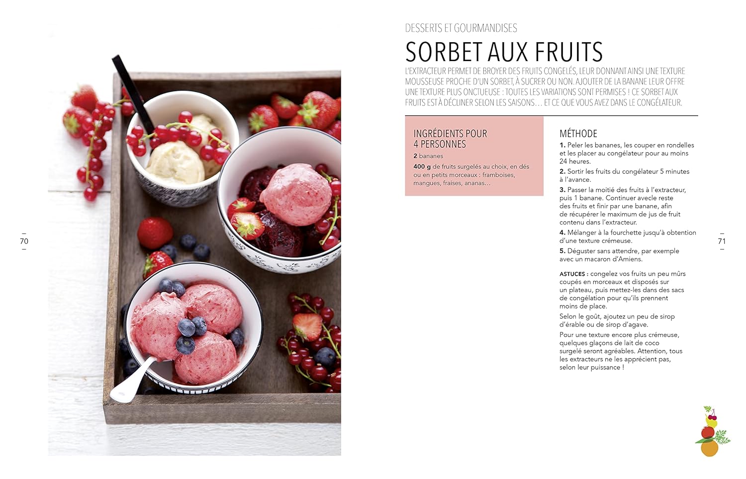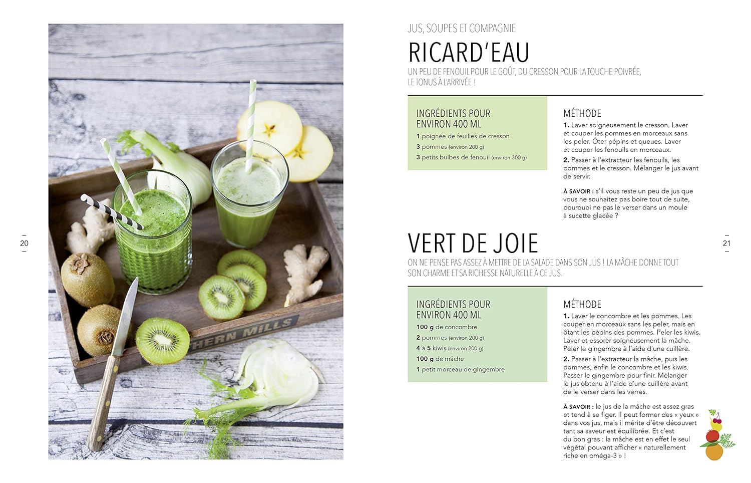 On apprend à concocter des cocktails énergisants et des jus savoureux. Astucieusement, le livre suggère des utilisations pour la pulpe résiduelle. Rien ne se perd !