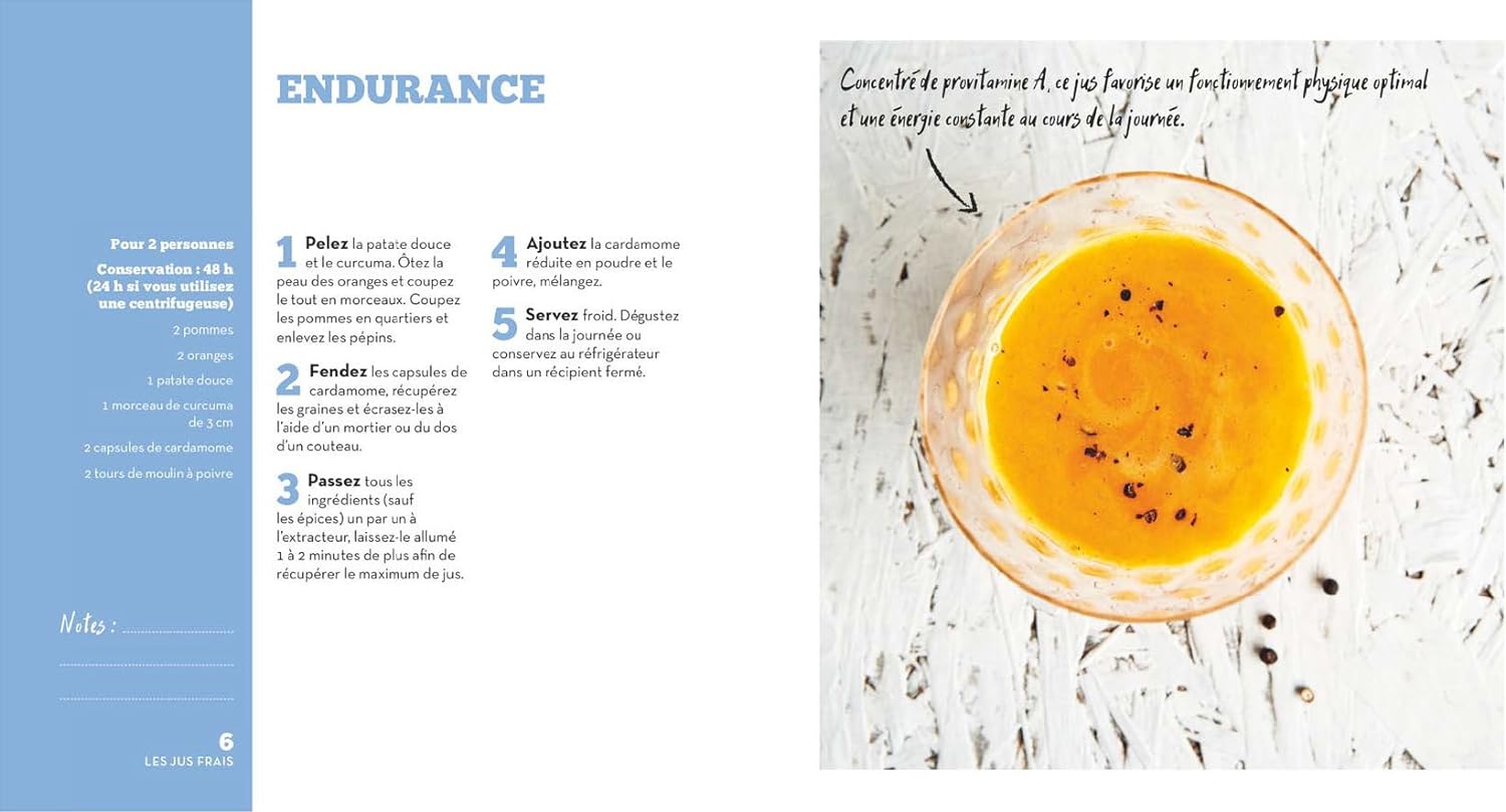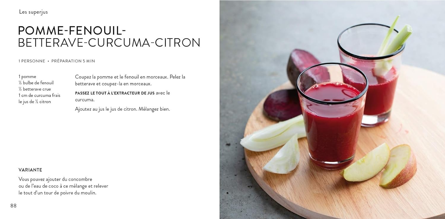 Peu d’ingrédients, préparation rapide : on apprécie cette simplicité. L’auteure nous guide vers des jus aux vertus variées. Endurance, beauté de la peau, detox du foie : chacun trouvera son bonheur ! Un livre qui allie gourmandise et bien-être avec brio.