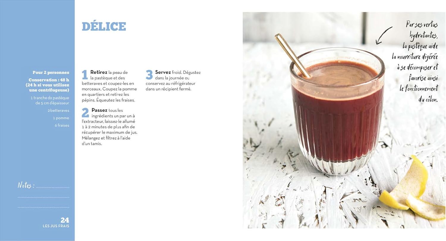 Ce livre propose 300 recettes de boissons préparées à l’extracteur de jus. On y découvre une variété impressionnante de jus, smoothies et nectars pour chaque saison. L’ouvrage met l’accent sur la méthode de pression à froid, qui préserve les nutriments des aliments.
