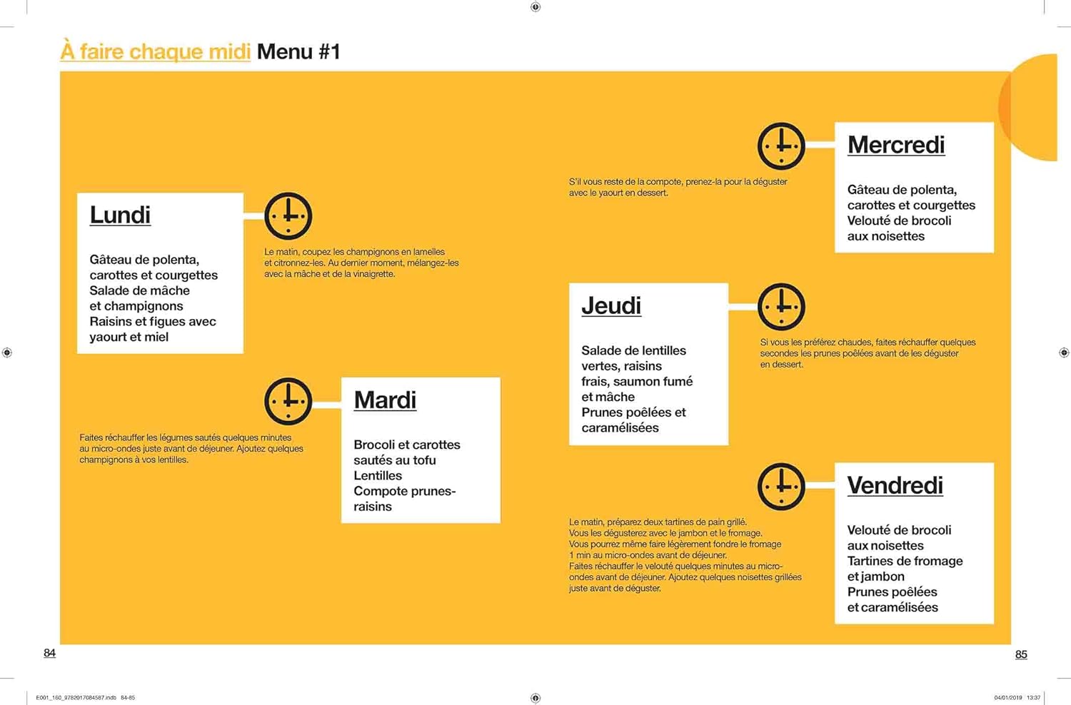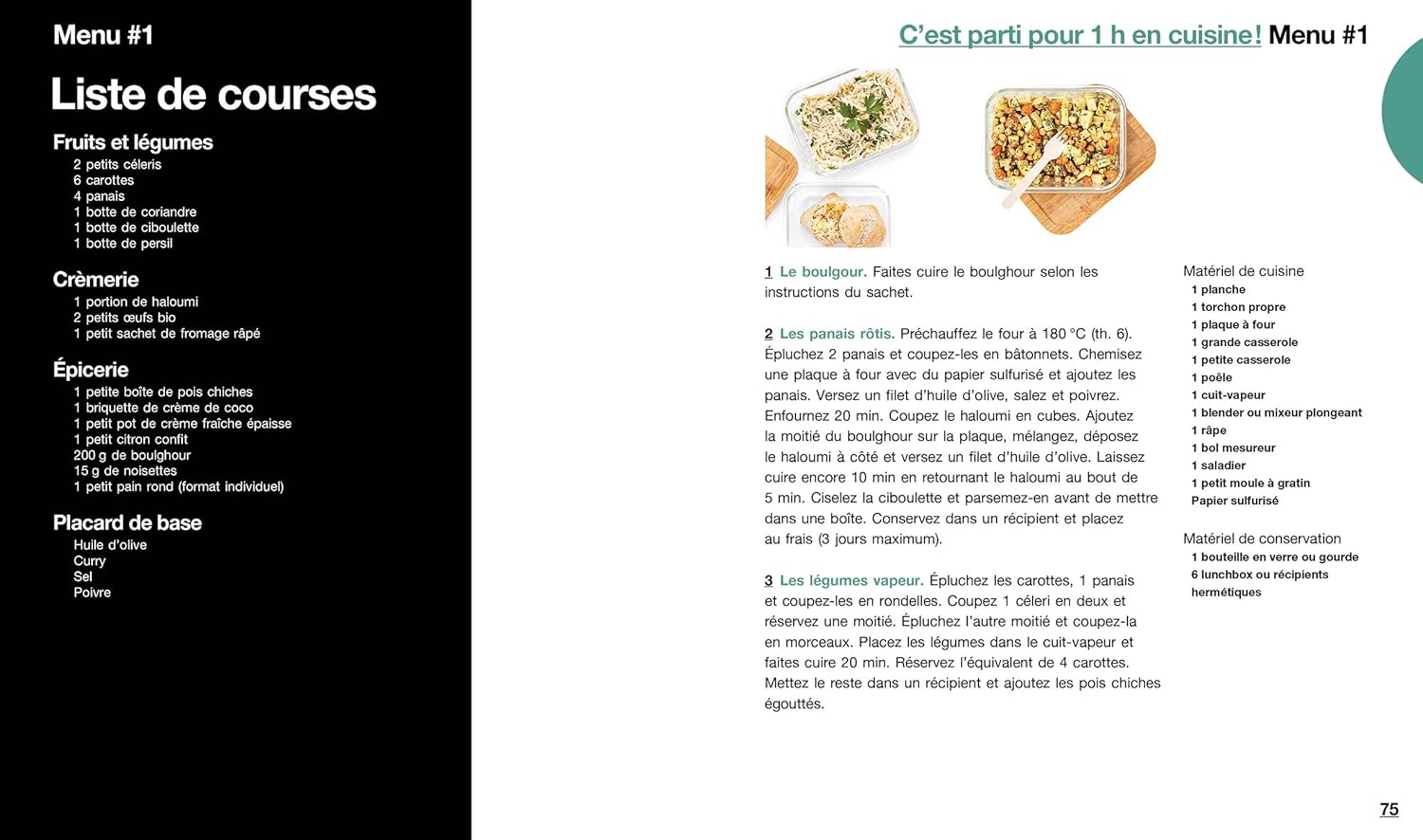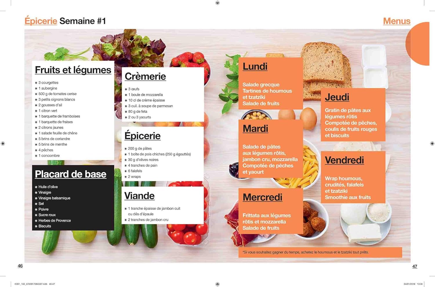 Le livre propose 16 menus hebdomadaires complets. Chaque semaine, on trouve une liste de courses, le déroulé des préparations et les gestes de dernière minute. Les produits frais et de saison sont à l’honneur. Isabelle Guerre a conçu des recettes anti-gaspi où tout est utilisé. Elle propose même des idées sucrées pour les gourmands.