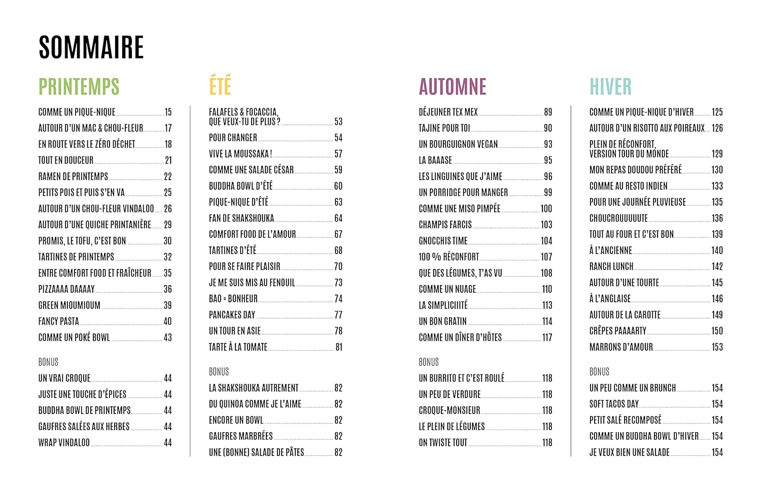 On y trouve des idées pour tous les appétits : salades revigorantes, petits plats mijotés, soupes onctueuses… Les auteurs n’ont pas négligé le dessert, avec une sélection d’en-cas sucrés qui raviront les becs sucrés.
