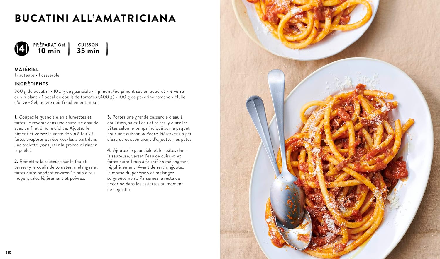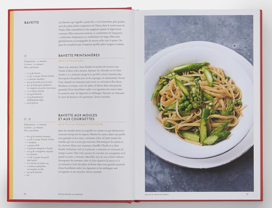 Au menu : des recettes végétariennes (linguine aux tomates cerise rôties et mozzarella, orecchiette aux brocolis et pignons de pin…), des plats à base de viande ou de poisson (carbonara à la pancetta, spaghettis aux palourdes…) et même des recettes sucrées (tagliatelles au chocolat et fruits secs). De quoi satisfaire toutes les envies !