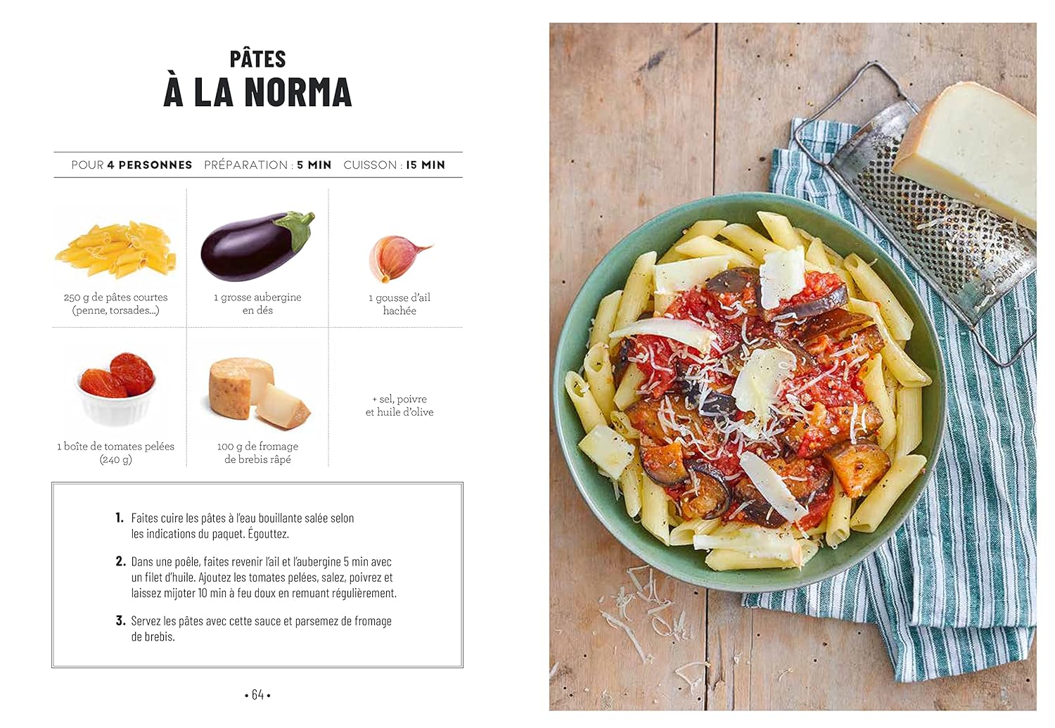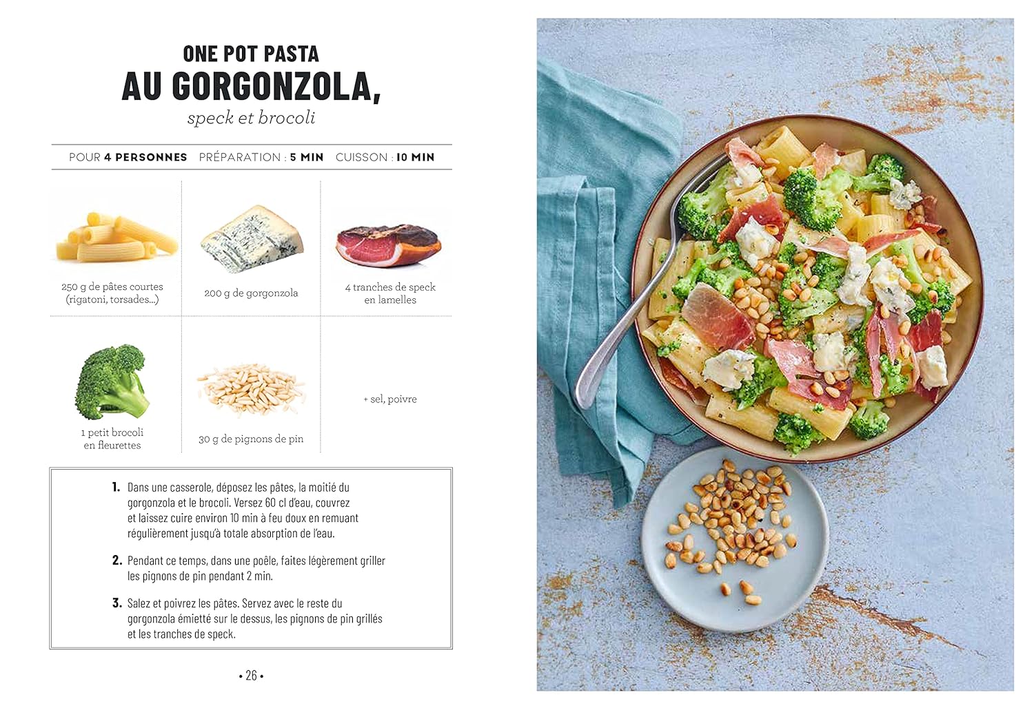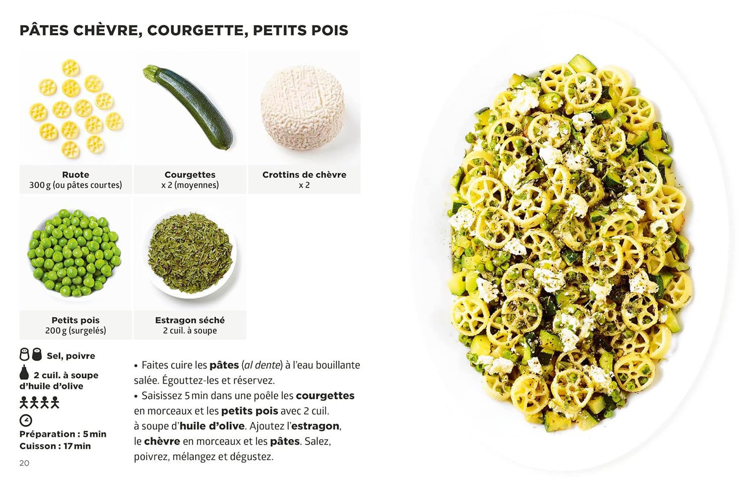 Au menu : des plats de pâtes à la viande (bolognaise, carbonara…), au poisson (saumon, crevettes…) ou encore veggie (pesto d’épinards, baked feta pasta…). Chaque recette ne nécessite que 5 ingrédients faciles à dénicher et 3 étapes de préparation.