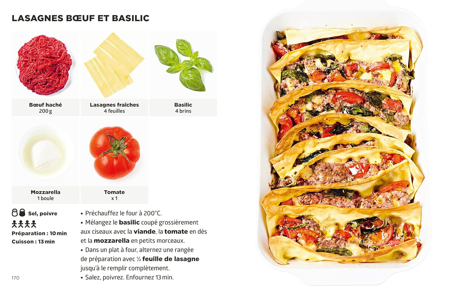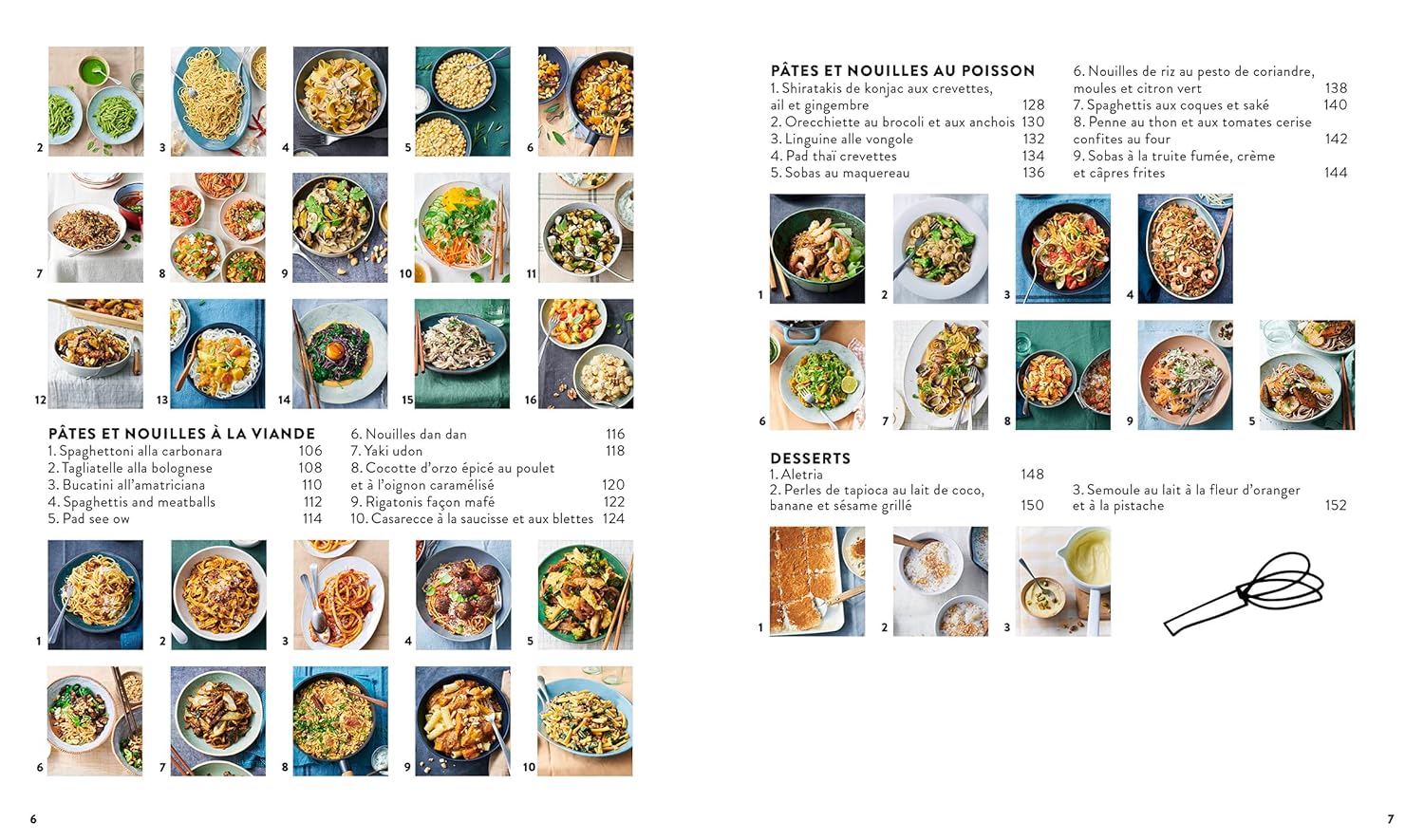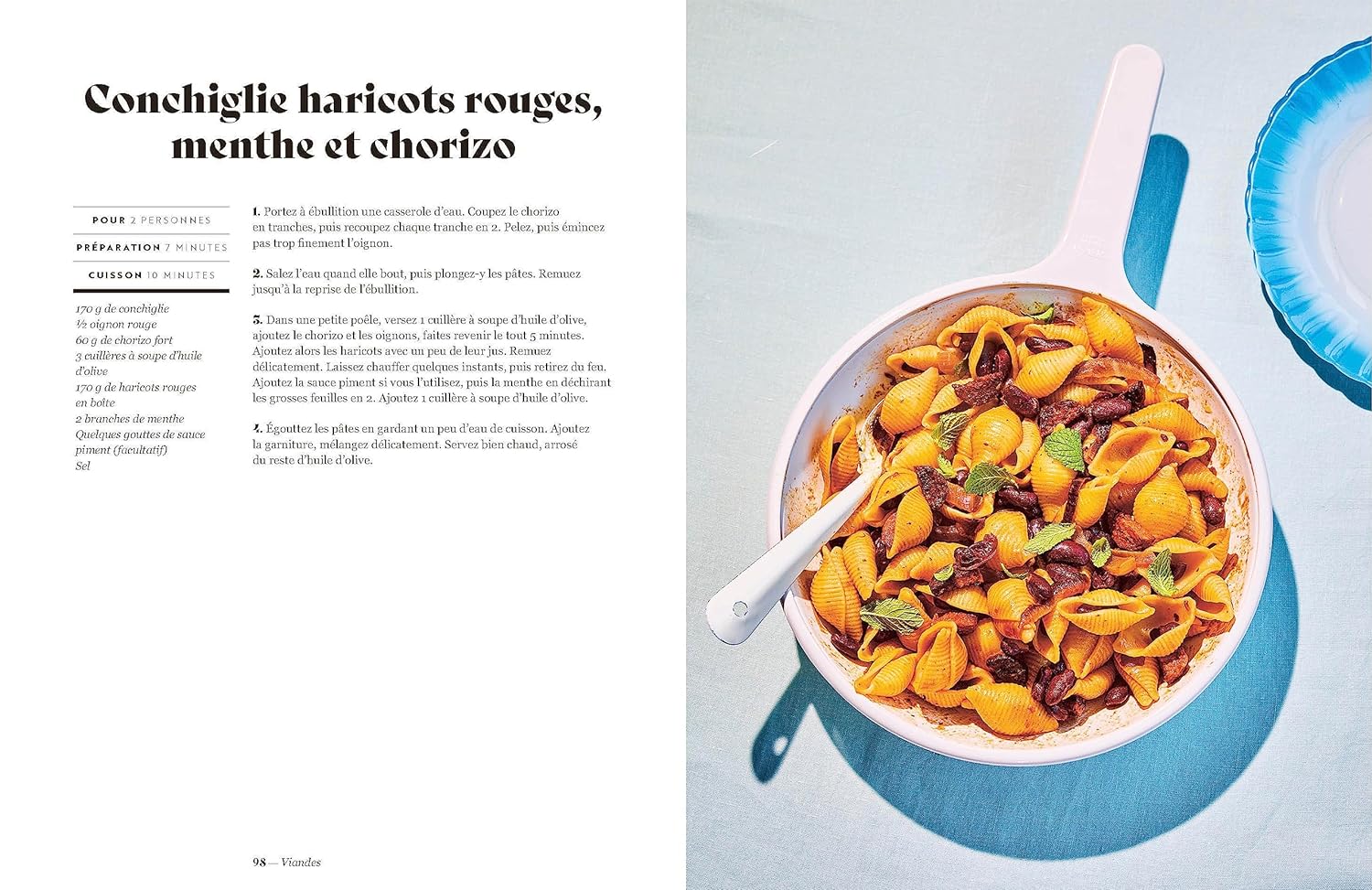 Au menu : des plats de pâtes à la viande (bolognaise, carbonara…), au poisson (saumon, crevettes…) ou encore veggie (pesto d’épinards, baked feta pasta…). Chaque recette ne nécessite que 5 ingrédients faciles à dénicher et 3 étapes de préparation.