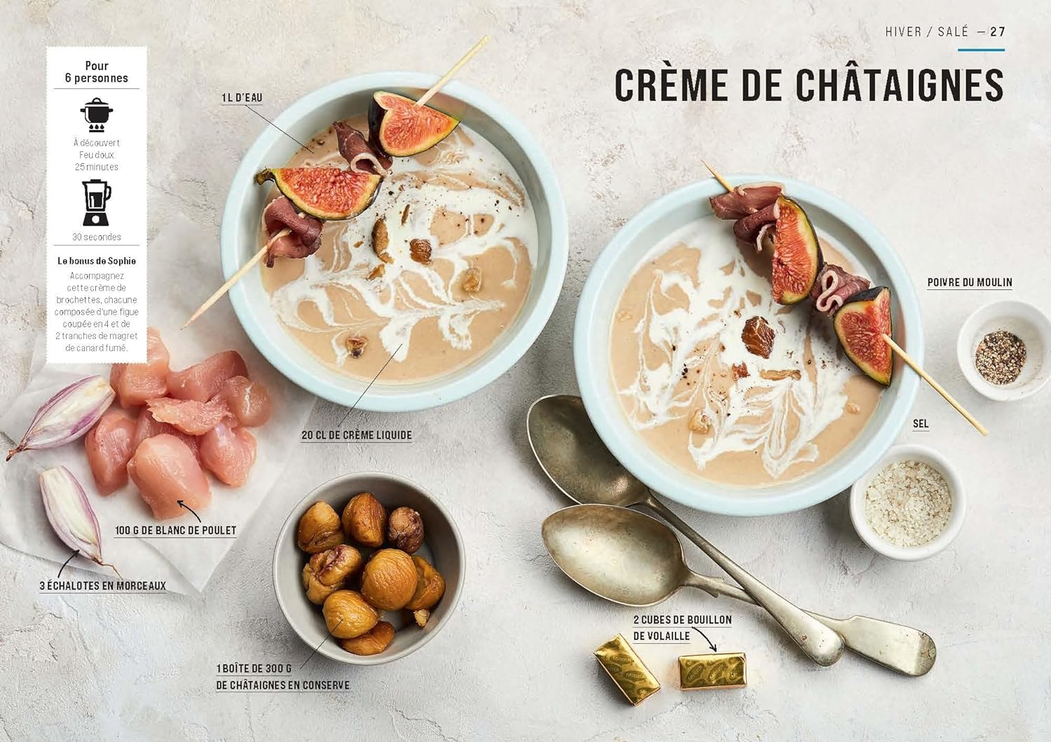 On y trouve 50 recettes qui renouvellent le genre. Veloutés onctueux, bouillons parfumés, gaspachos (soupes froides) originaux : la variété est au rendez-vous. L’ajout de protéines (viandes, fromages, crustacés) transforme chaque soupe en repas consistant.
