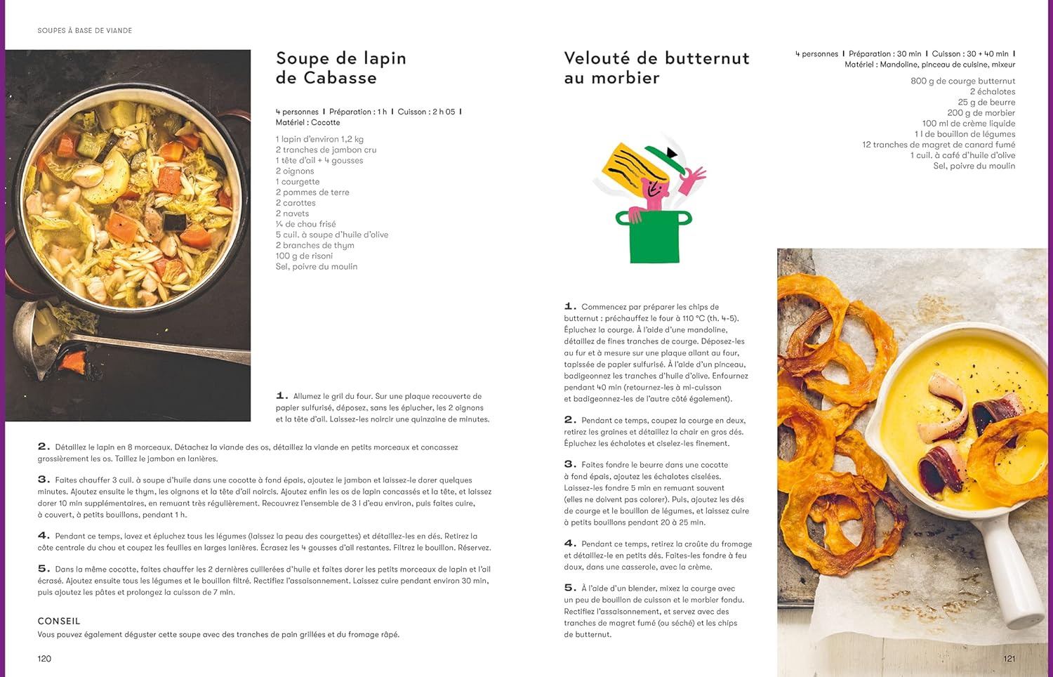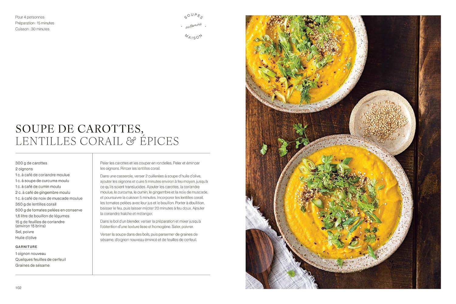 On navigue entre bouillons détoxifiants et veloutés onctueux. Les auteures nous renseignent sur l’utilisation judicieuse de céréales, légumineuses (haricots, lentilles, pois chiches) et légumes de saison.